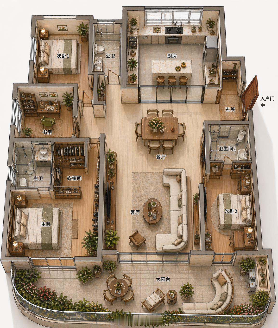 140㎡四房二卫,把改善的舒适度直接拉满!餐客通厅LDK一体化,空间开阔无