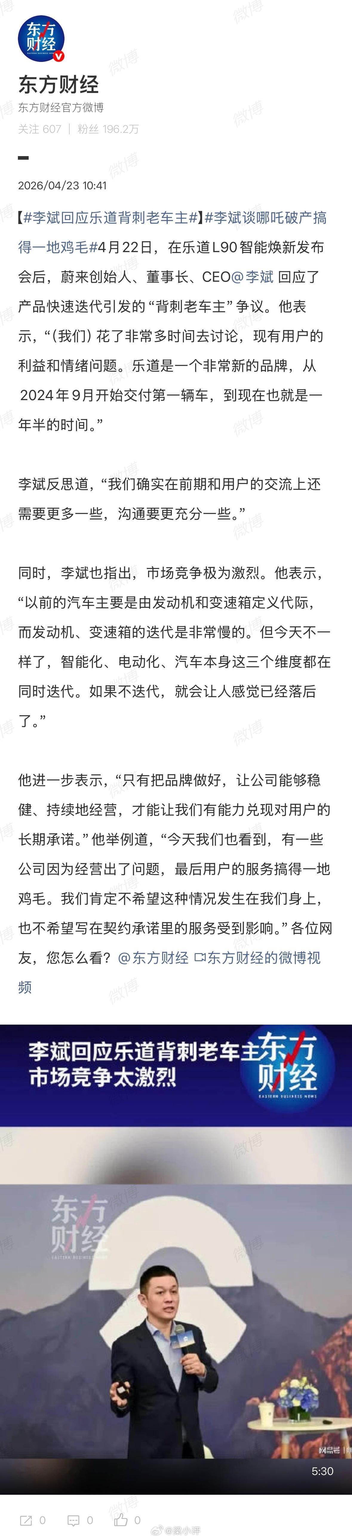 李斌回应乐道背刺老车主:“如果不迭代,就会让人感觉已经落后”新能源汽车这块,大家