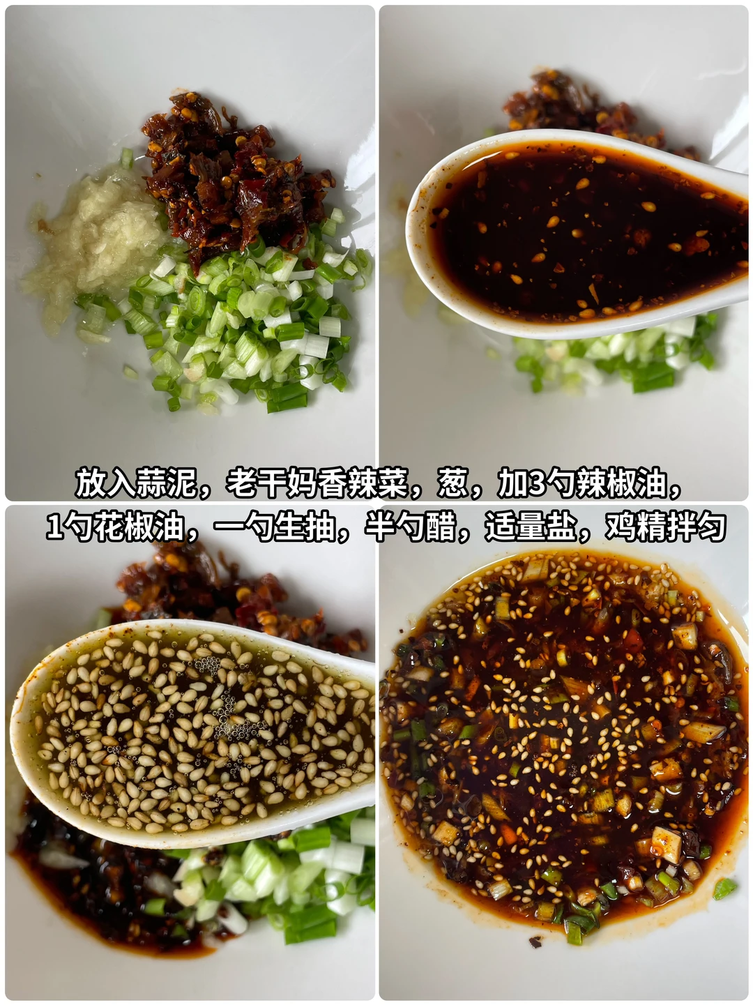 先调一个料汁,碗中放入蒜泥、老干妈、香辣菜和葱。加入3勺辣椒油,1勺花椒油,1勺生抽、半勺醋、适量的盐和鸡精拌匀备用。