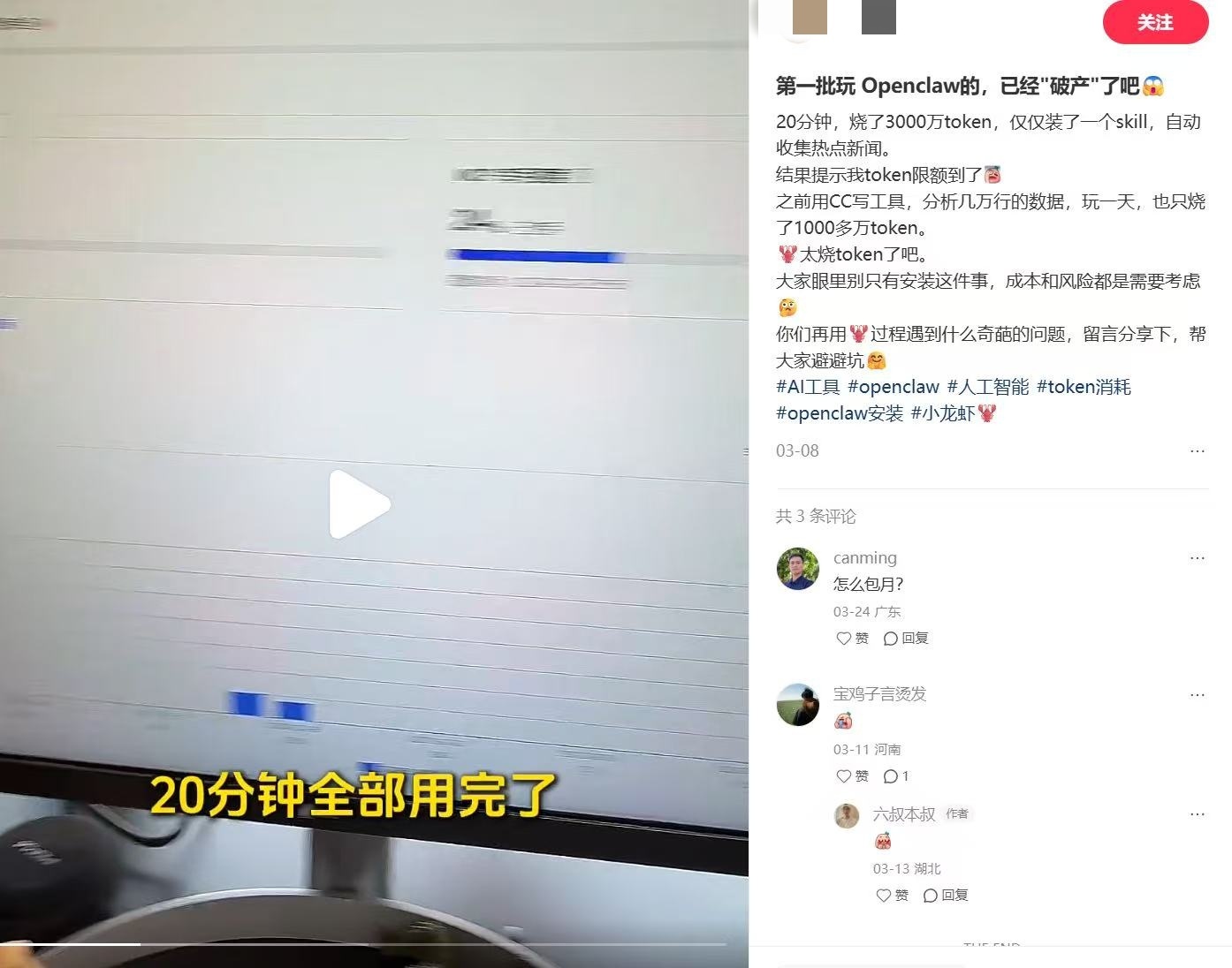 【#39元token月套餐5天烧完#】#网友曝龙虾大部分token被浪费掉# 4月23日,成都孙女士透露,5天前,她购买了一款39元大厂的TokenPlan月套餐,套餐额度有3500万token(词元),用于驯养自己的小龙虾。孙女士设置了2个定时简报任务,并对简报模型进行了数次调整,同时装了几个skill。结果5天后token就被全部烧光。过程中,当孙女士发现token告急时还采用了多种办法节省流量,清空对话后啥都没调取使用,结果半夜还是被跑完token。红星新闻记者上网查询发现,不少网友反映小龙虾抓取数据会消耗大量token,而输出结果所用的token其实极少。网友称,原来小龙虾大部分Token都是浪费掉的。你遇到这种情况了吗?评论区分享。#第一批养龙虾的token破产#