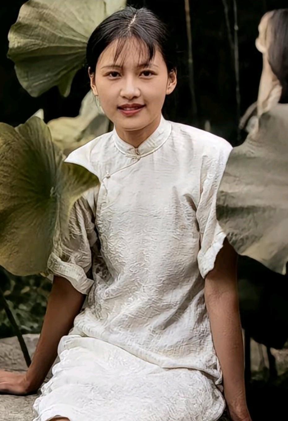 这是另外一张照片的女孩子,她着一件月白色的旗袍,旁边是田田的荷叶,仿佛是在荷花池中拍摄的,嘴角含笑,眼神温柔,颇有一些莲花出污泥而不染的韵味。