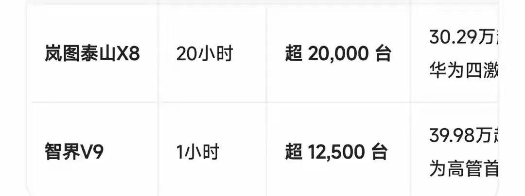 泰山X8预售53分钟订单破1.5万台,20小时突破2万台;鸿蒙智行旗舰MPV智界V9预售1小时订单达1.25万台。