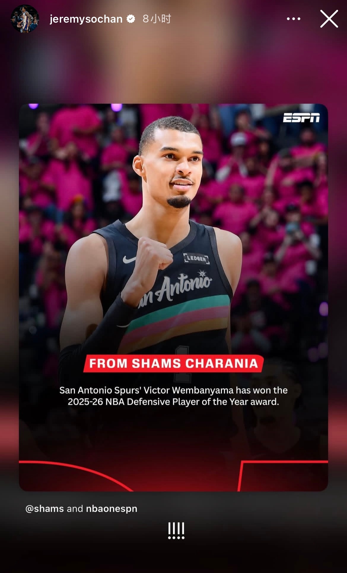 此外索子也祝贺文班荣获DPOY