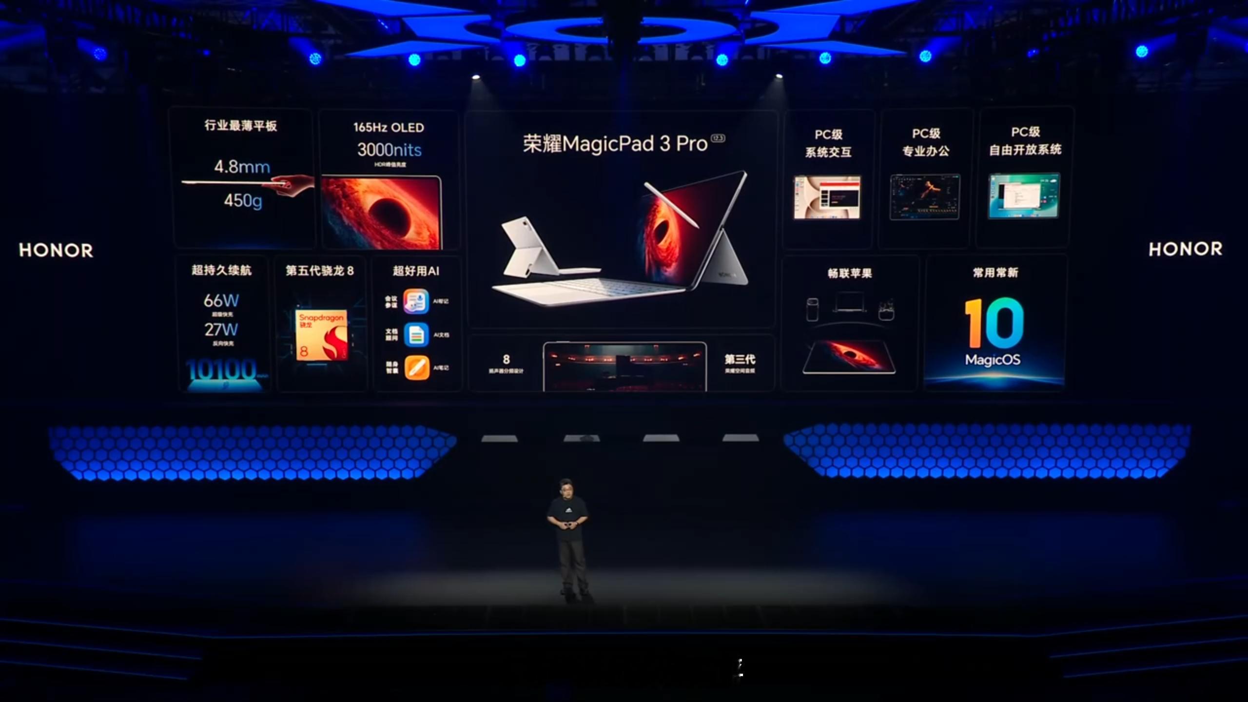 除了笔记本之外,本场发布会还带来了全新的耀子Pad新品——荣耀MagicPad3Pro 。一台采用12.3英寸屏幕的Pad,机身厚度居然仅为4.8mm,重量仅450g,结合航天级纤维材料与高强铝一体化锻造工艺,这质感很ok~荣耀平板荣耀WIN游戏本