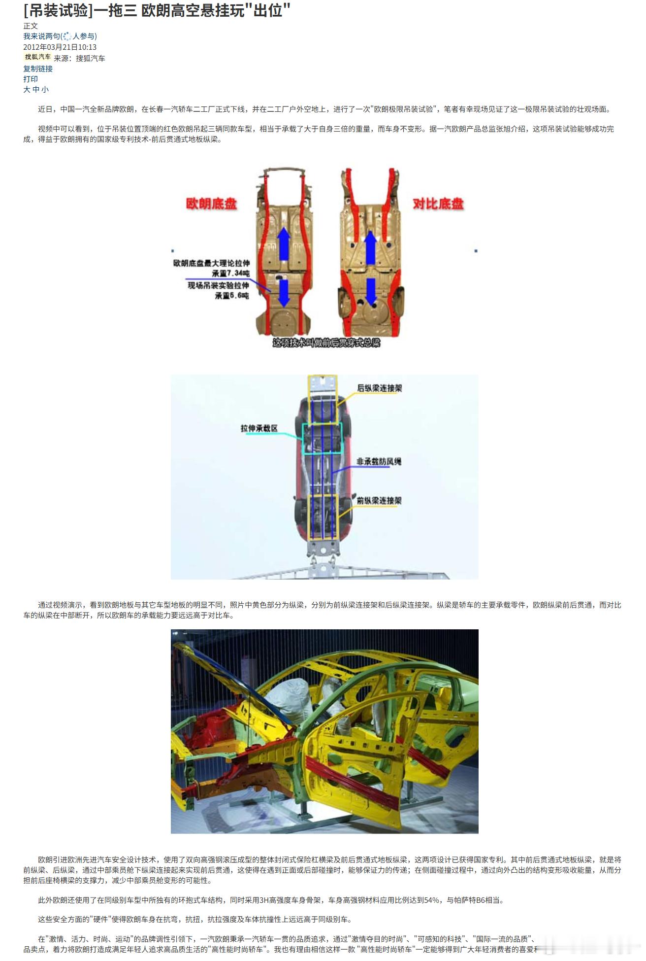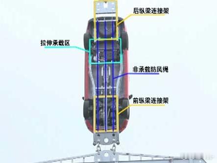 “顶端的红色欧朗吊起三辆同款车型,相当于承载了大于自身三倍的重量,而车身不变形。据一汽欧朗产品总监张旭介绍,这项吊装试验能够成功完成,得益于欧朗拥有的国家级专利技术-前后贯通式地板纵梁。”