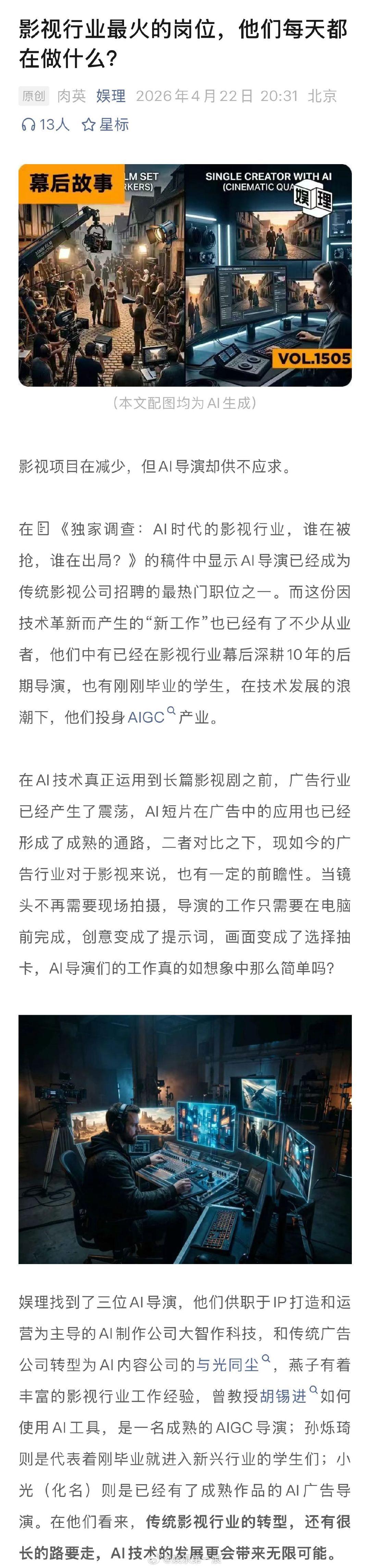 导演说观众反感的不是AI而是劣质内容 业内谈会被AI替代的传统影视岗位 AI导演们怎么看"AI内容是预制菜、没有锅气"这件事?小光说:“好的AI内容还没有来到大众面前。观众到底反感的是劣质AI内容,还是反感AI本身,还是那个AI制作的提示标签?我觉得对于好内容,大家应该不会介意是不是AI做的。”娱理独家↓