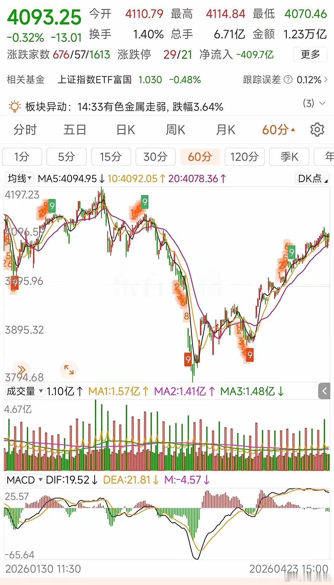 更新数据中信中证500减空241,净空7179沪深300减空655,净空9121上证50加空360,净空11371中证1000加空1460,净空31480中信今日累计加空925,净空单总数59151主要玩家数据中证500减空2784,净空31296沪深300减空2523,净空20947上证50加空698,净空18328中证1000减空3597,净空45773主要玩家今日累计减空8206,净空单总数116344三市成交28236亿,较上个交易日放量2445亿,主力净流出1183.83亿,两融余额27206.9亿,较上个交易日增加140.21亿。上证指数收了根高开低走带下影线的阴线,早上高开诱多了一下,随后下杀,第一次下杀有所放量,估计有聪明的资金提前跑路了,第二次下杀没有怎么放出量能,也就是第二次交出筹码的人不多,可以理解为主力只出了一部分货,还没有出完,所以尾盘又拉了回来。从深成指,创业板指还有科创综指量能也可以看出,这种量能不足以把货出完,出不完就还会诱多,不排除再次创出新高,这些都取决于量能,没有爆出量能,暂时不会有大的风险。上证,深成和科创都拉回到了5日线上方,短期不破五日线就可以格局,承受能力差一点儿可以观察60分钟10日线,破了10日线降低仓位,这些都是已收盘为准。明天看修复力度,力度好就格局,不好降低仓位。