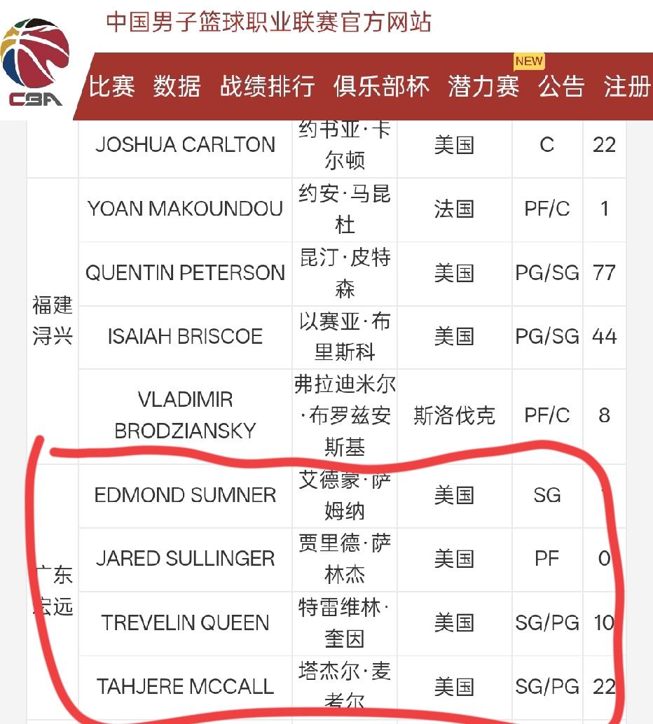 明天24日是cba外援注册截止日期。但是广东宏远还是原来那四个外援,分别是萨林杰、萨姆纳、奎因和麦考尔。新来的外援拉科塞维奇并没有注册,据了解他目前随队去福建客场。