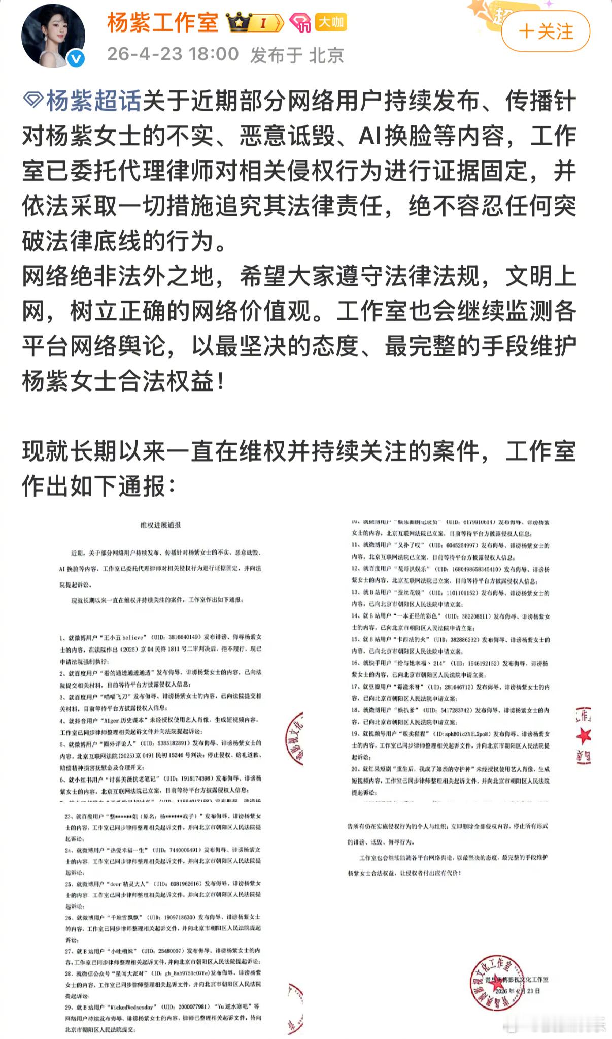 告黑最新进展🈶!称关于近期部分网络用户持续发布、传播针对杨紫女士的不实、恶意诋毁、AI换脸等内容,工作室已委托代理律师对相关侵权行为进行证据固定,并依法采取一切措施追究其法律责任,绝不容忍任何突破法律底线的行为。