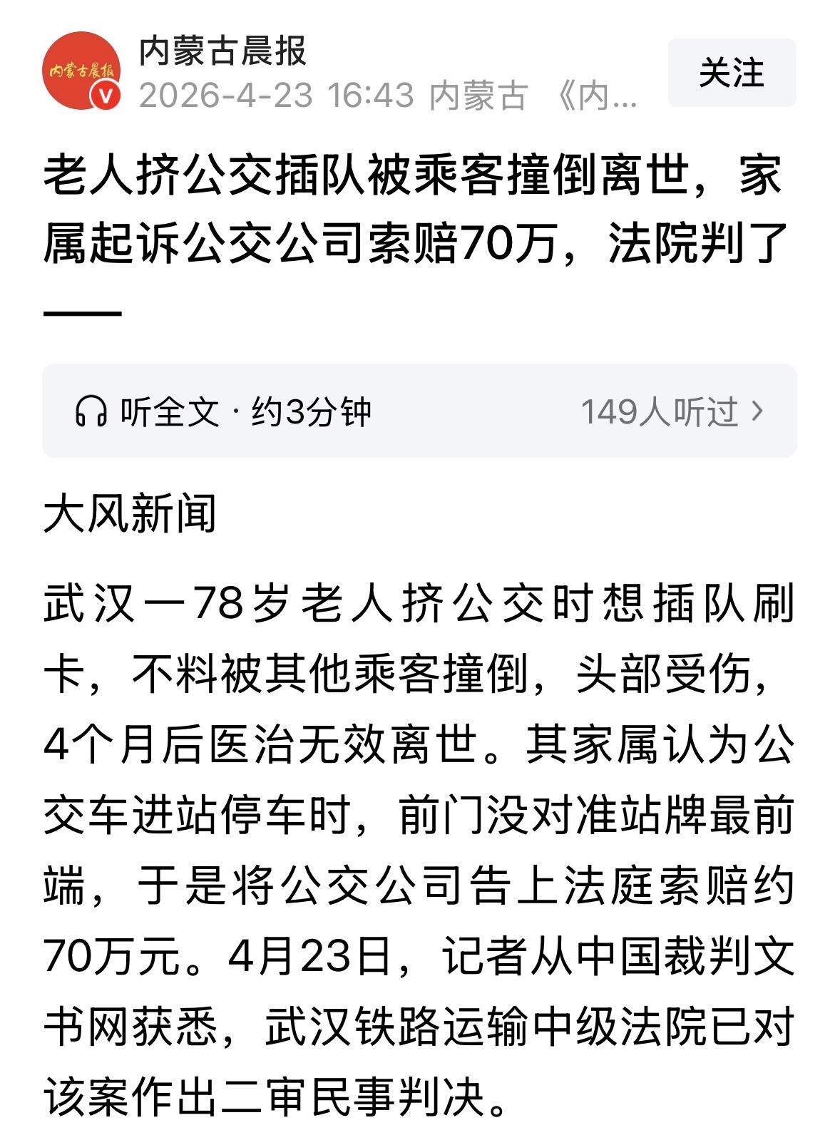 家属不服,又上诉到中级法院。二审法官认为,程某的顶撞是直接原因,老人插队本身就有错,而且事发后家属无视司机和乘客的救助建议,坚持不报警不去医院,这才是导致死亡的关键延误。