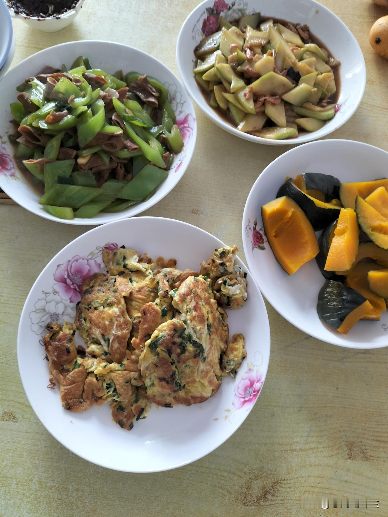 今天中午三个菜,尖椒炒小肠, 素炒西葫芦,韭菜炸鸡蛋。