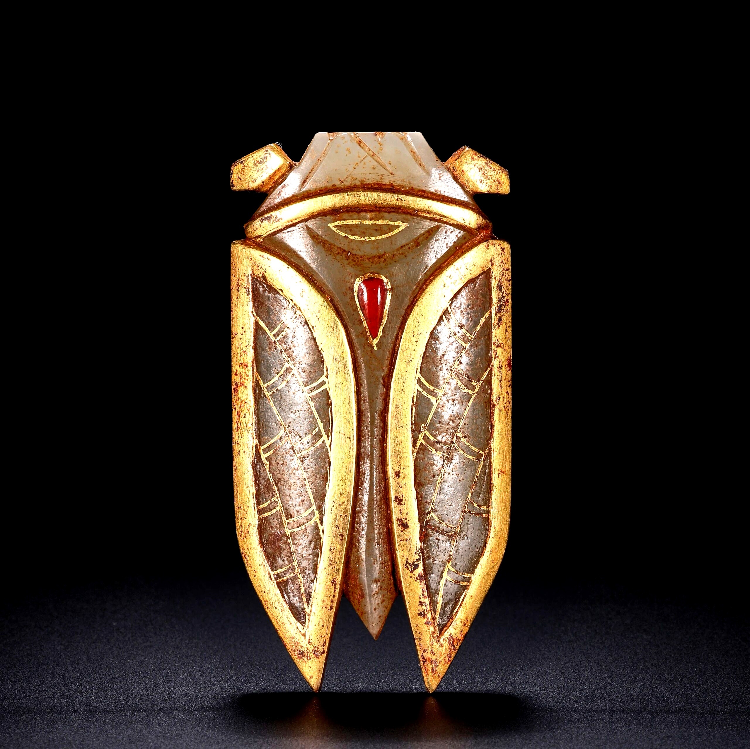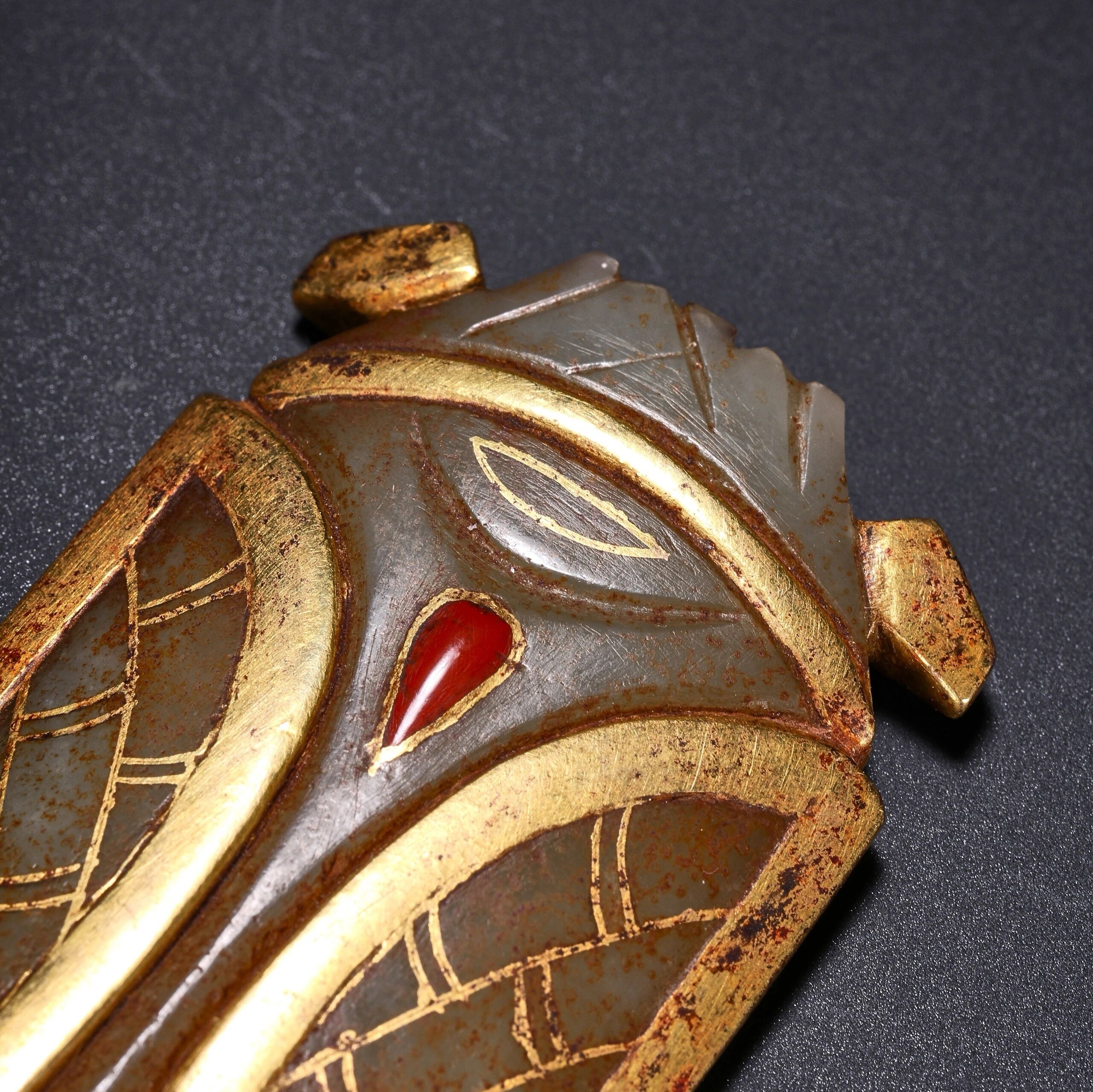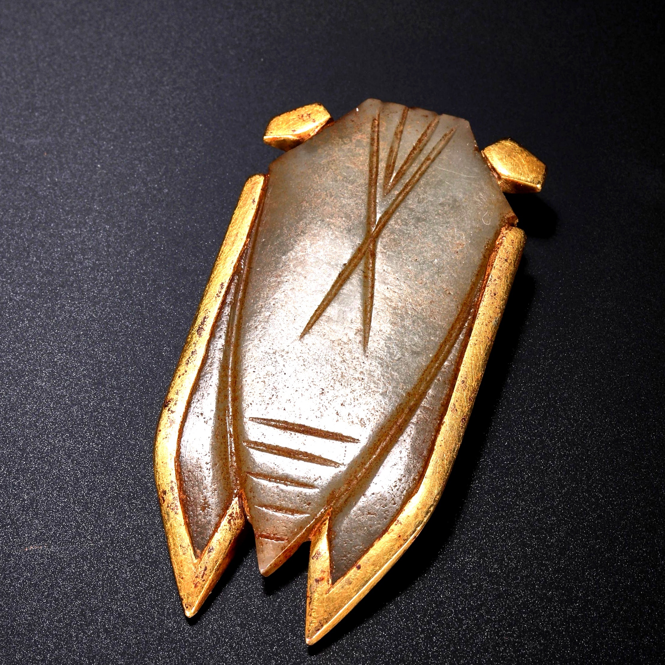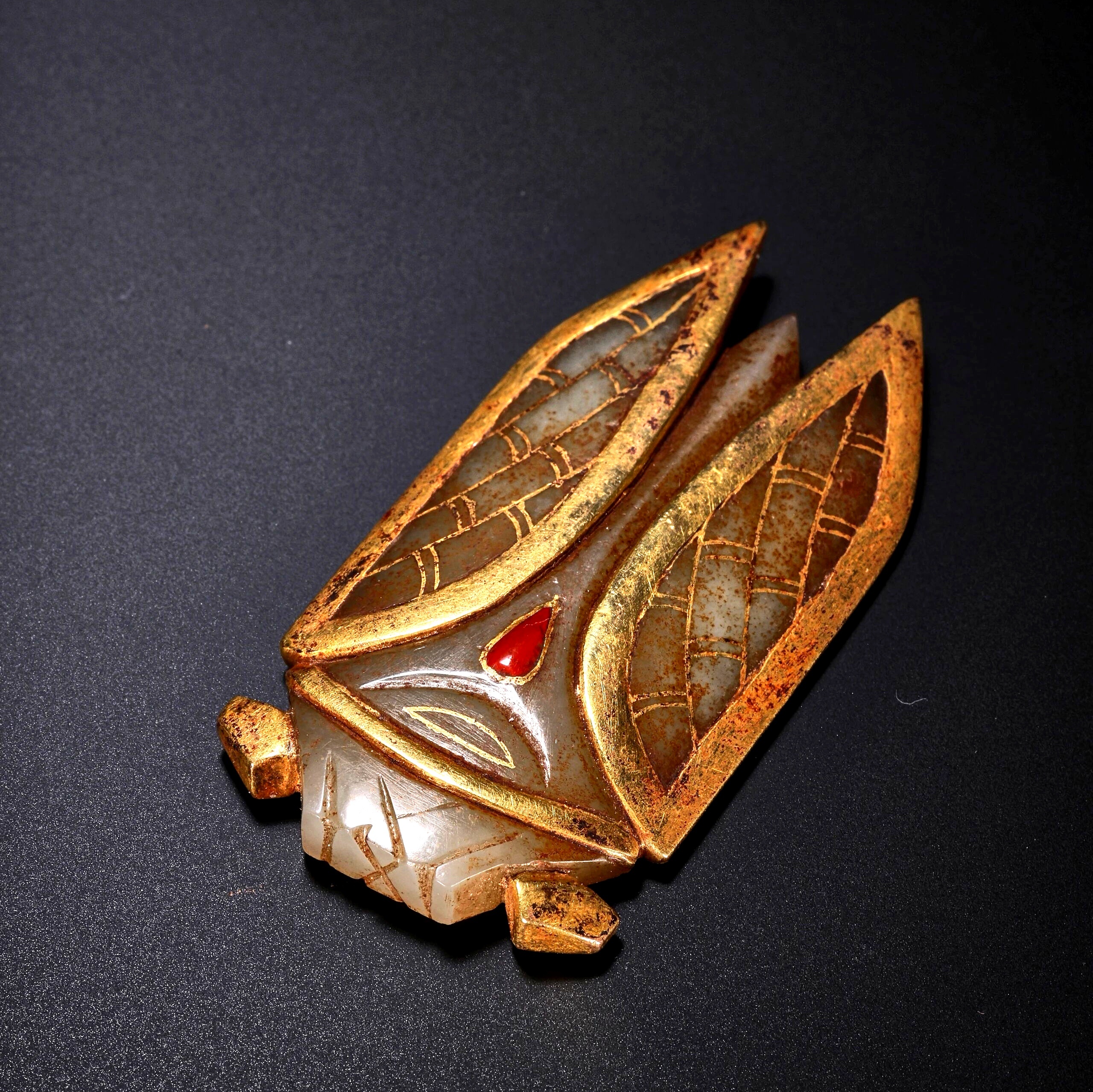古玉杂谈 玉蝉金翅,背间嵌宝,是一件少见的汉代八刀蝉。两膀估计非汉人所为,是后人
