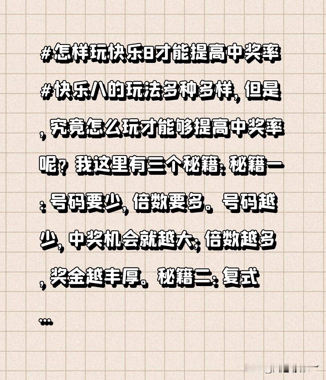 快乐8玩法丰富多样,可究竟怎样玩才能提高中奖率呢?我这儿有三个秘籍: