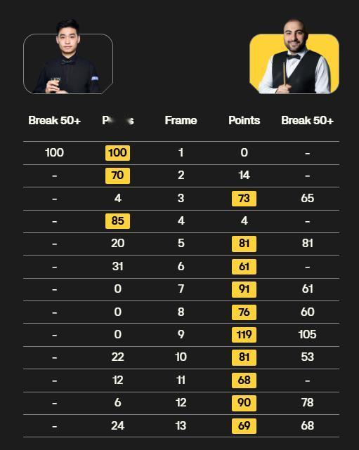 比赛进入第二阶段的角逐,第10局本来获得不错机会,结果自己又没能把握,击球过重出现简单失误,几乎将胜利拱手相让,22-81落败,他已经被六连鞭,这还是非常影响心态。瓦菲则继续扩大优势,这段时间展现的技术稳定性更胜一筹。