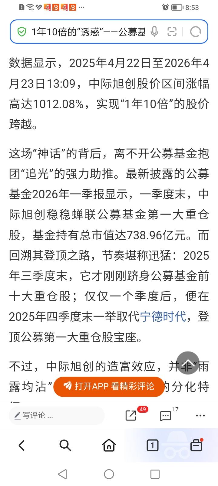 中际旭创成为公募基金今年一季度的第一重仓股,公募基金抱团追光成为中际旭创一年十倍暴涨的最大推手。