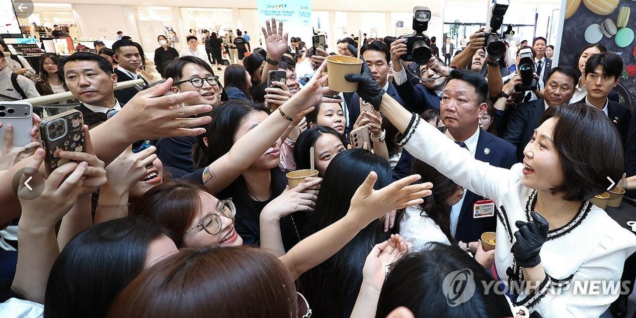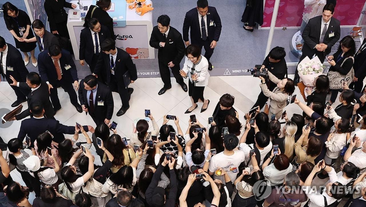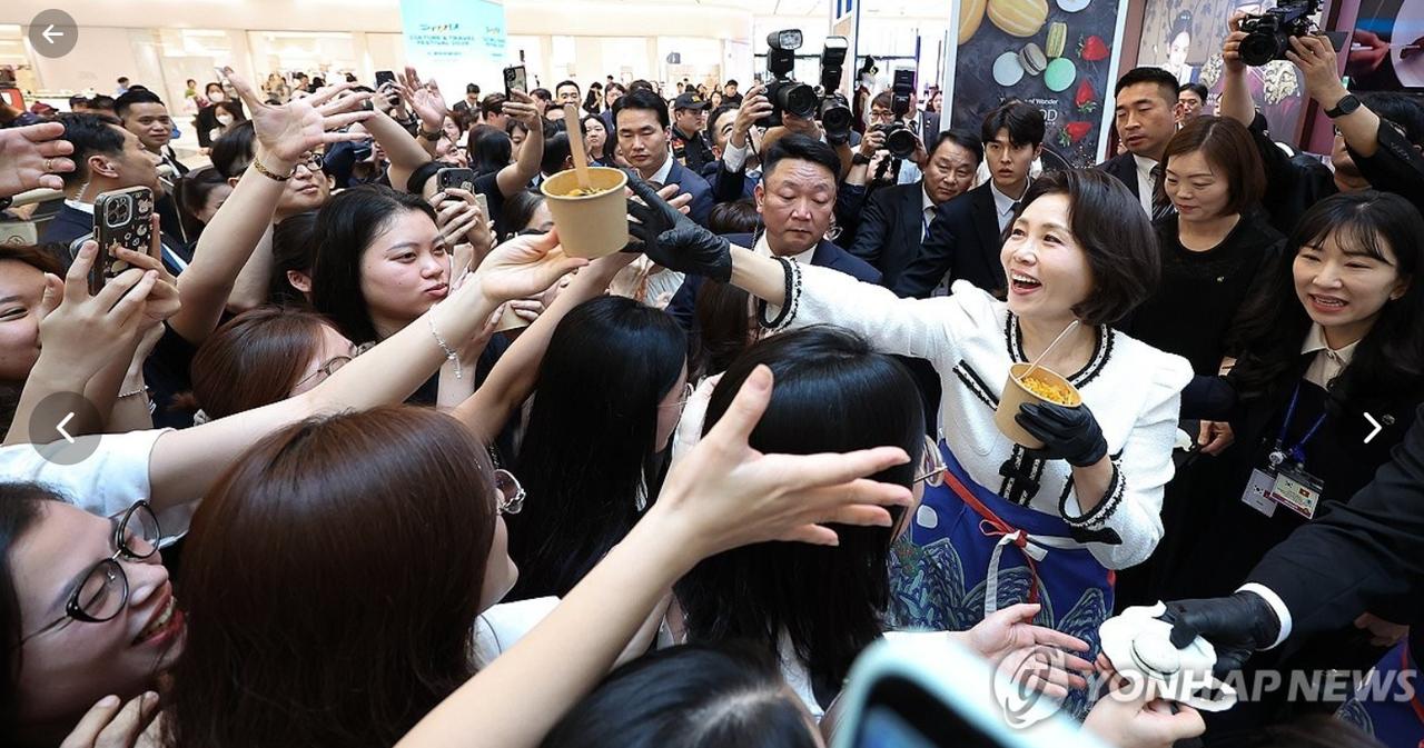 4月23日韩国第一夫人金惠景亮相越南河内乐天购物中心举行的韩国文化旅游博览会,让人没想到的是韩国第一夫人的到来吸引了不少顾客前来购物,活到现场可以用“人山人海”这四个字来形容,太热闹啦!