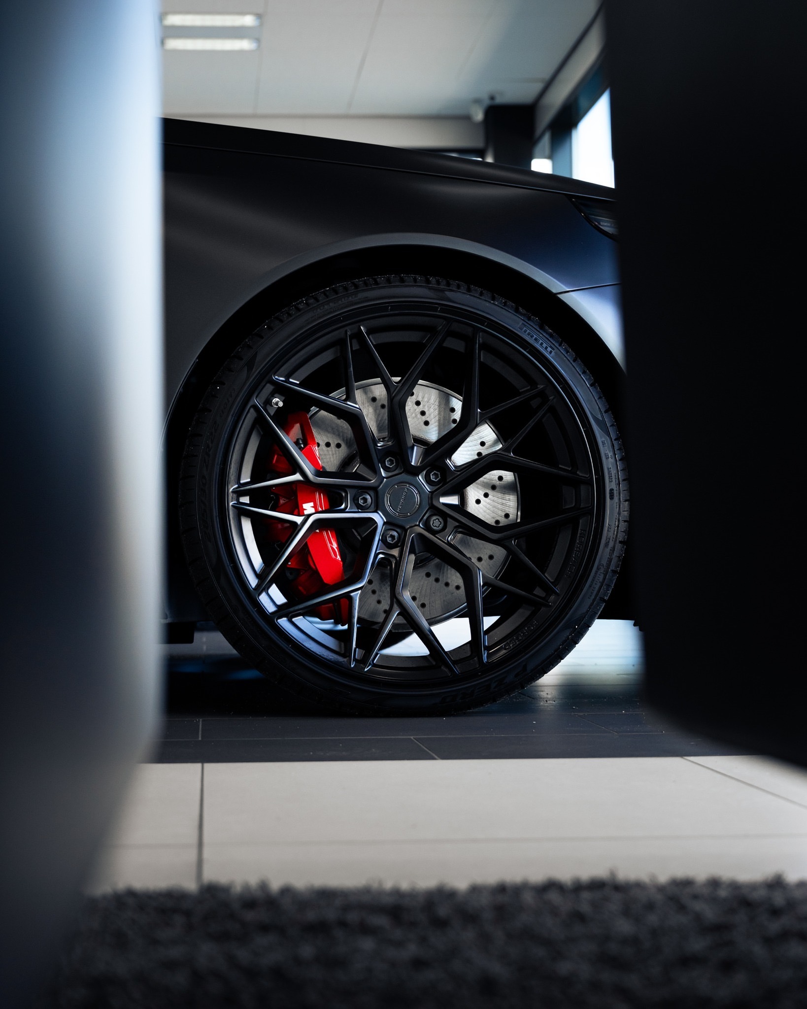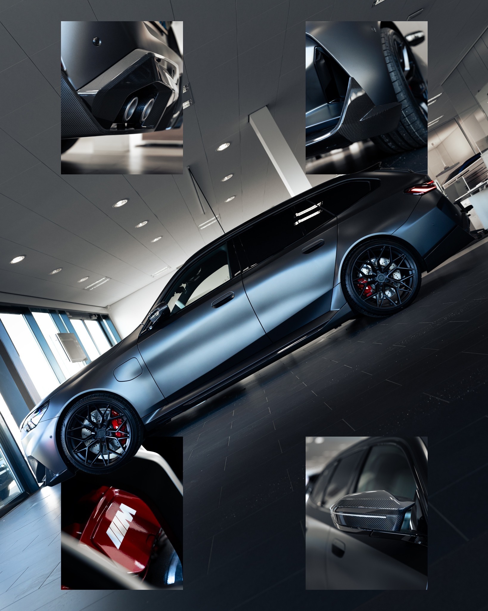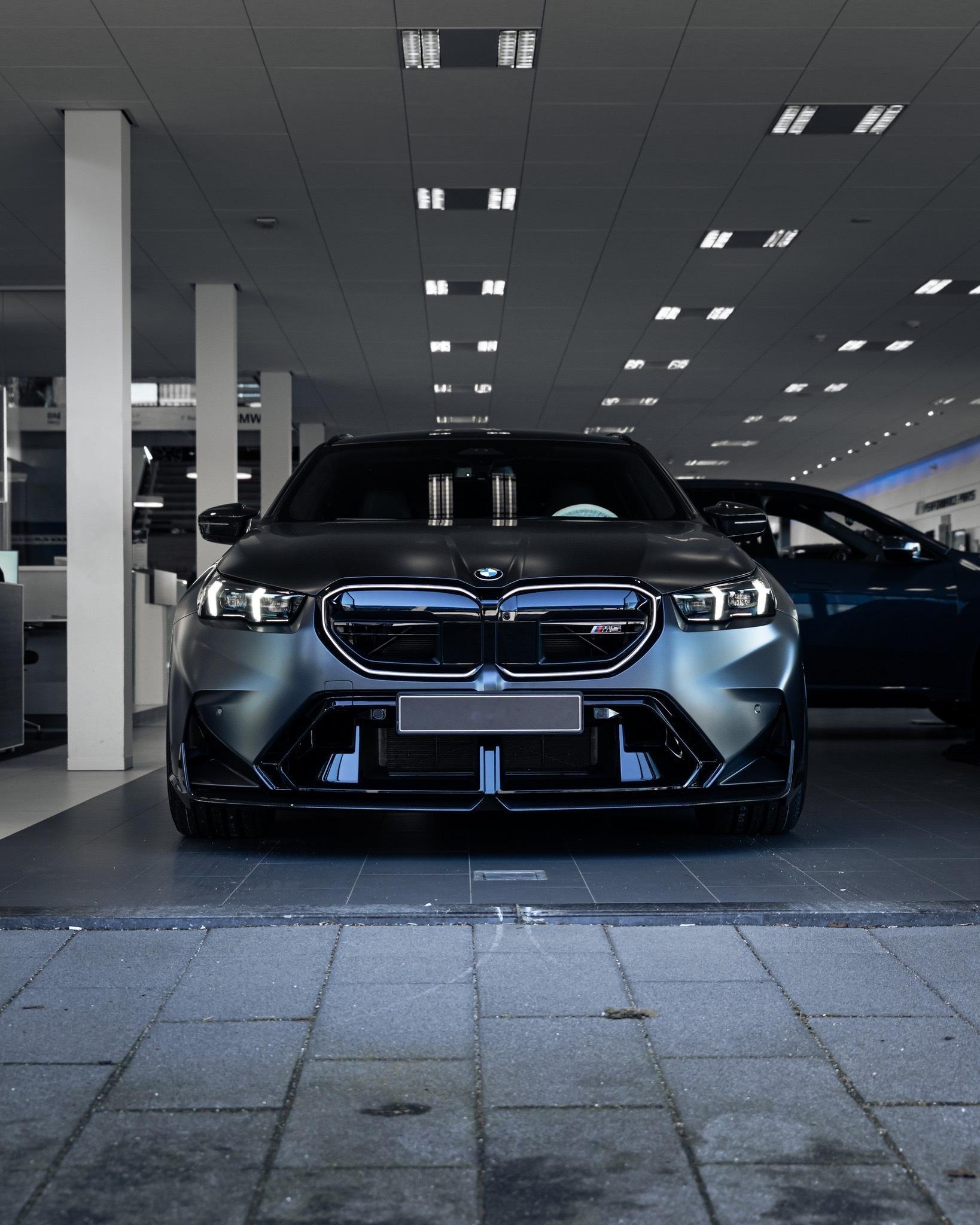 采用BMW Individual Frozen Deep Grey metallic哑光深灰金属漆,配备Carbon M碳纤维套件、红色制动系统、全景玻璃天窗以及Korbach PS3哑光黑轮毂。此外,这台M5还全车贴覆了PPF隐形车衣,以完美保护哑光漆面。