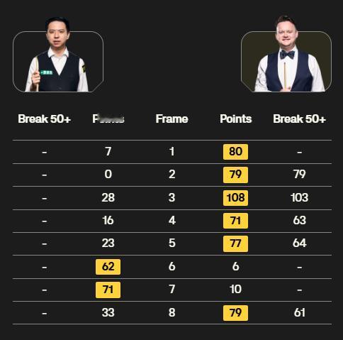 比赛开场墨菲更快调动,准度不错,机会球基本能把握,80-7顺利赢下首局,接着保持手感,单杆50+,以79-0再下一城,整体节奏比较到位。肖国栋状态稍显紧绷,本来上手的次数屈指可数,部分选择还不太理想,如此一来情况就较为严峻。