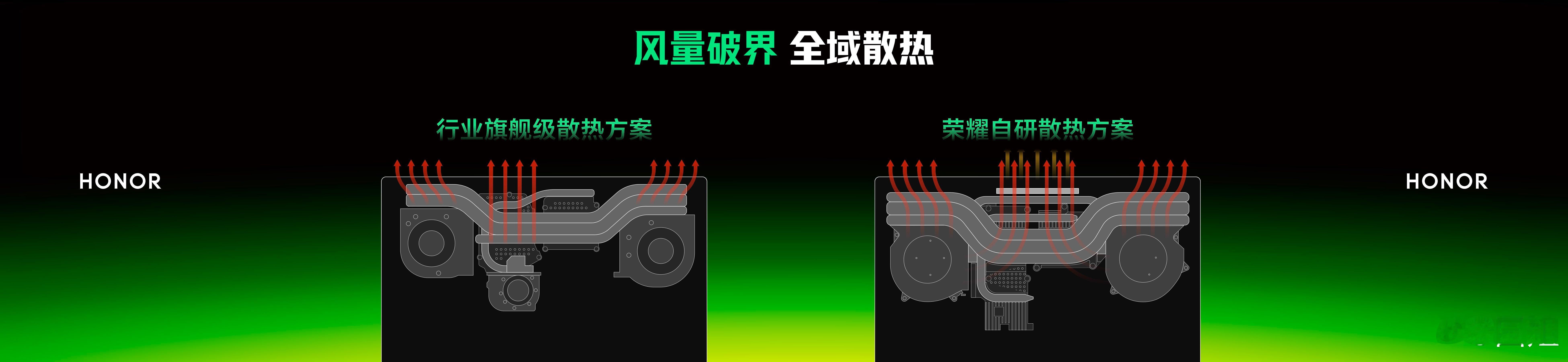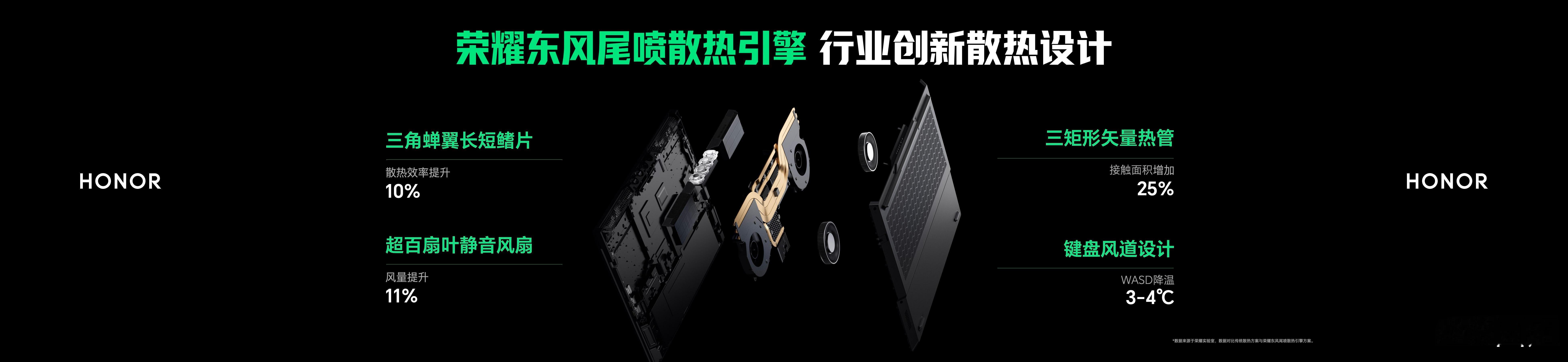 荣耀自研东风尾喷散热引擎,将荣耀WIN游戏本 的性能释放突破至270W,针对行业痛点,荣耀自研离心轴流混吹系统,重构风道设计,实现CPU与GPU双区域全面覆盖,较传统方案提升内吹区域风量57%,确保核心硬件热量快速导出,带来20W的性能释放提升。荣耀发布会