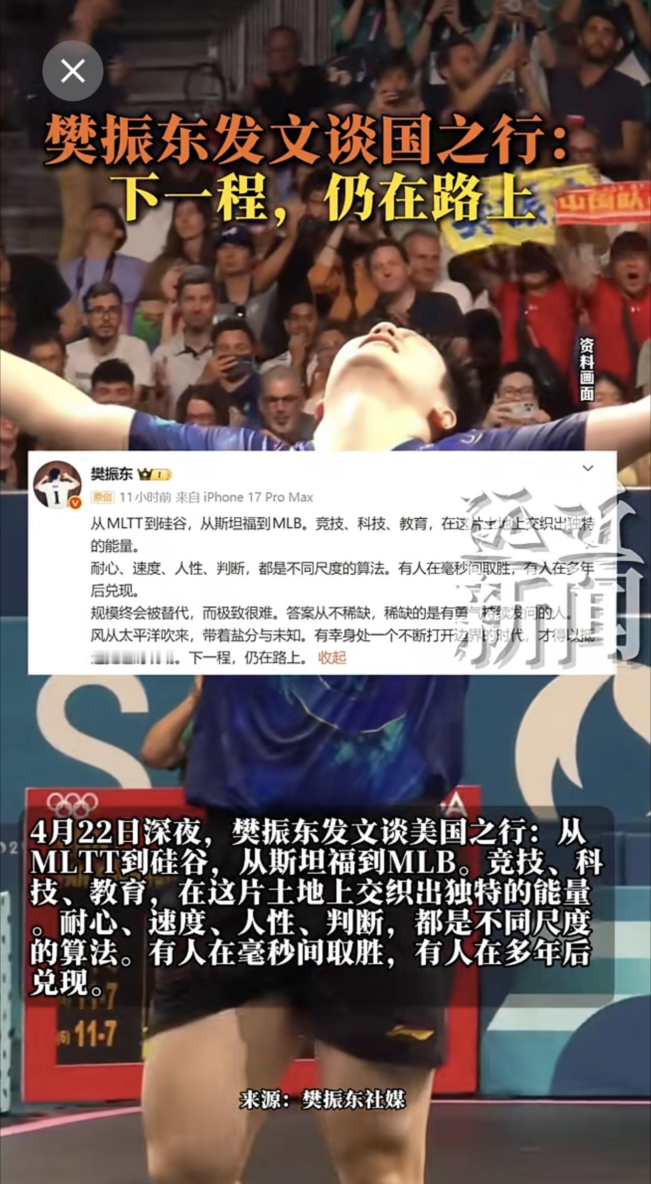 4月22日深夜,樊振东发文谈美国之行:从MLTT到硅谷,从斯坦福到MLB。竞技、科技、教育,在这片土地上交织出独特的能量。耐心、速度、人性、判断,都是不同尺度的算法。有人在毫秒间取胜,有人在多年后兑现。规模终会被替代,而极致很难。答案从不稀缺,稀缺的是有勇气持续发问的人。风从太平洋吹来,带着盐分与未知。有幸身处一个不断打开边界的时代,才得以抵达更远的现场。下一程,仍在路上。