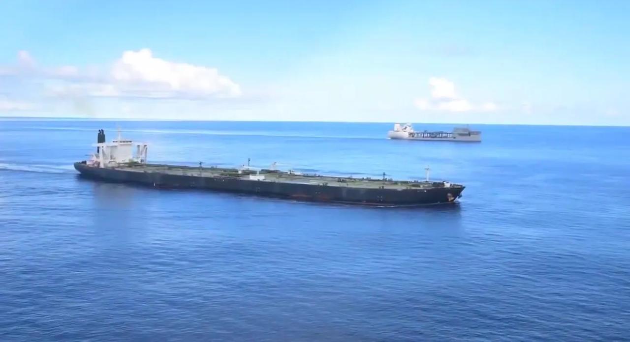 该28万吨位的油轮现名为Majestic X,之前多次更改船名,属无国籍影子船队。4月初在阿曼湾发出AIS后“消失”两周;本周初重新出现在印度南方,向东航行,直至到了斯里兰卡以东约400英里处被美军实施登船拦截行动 。