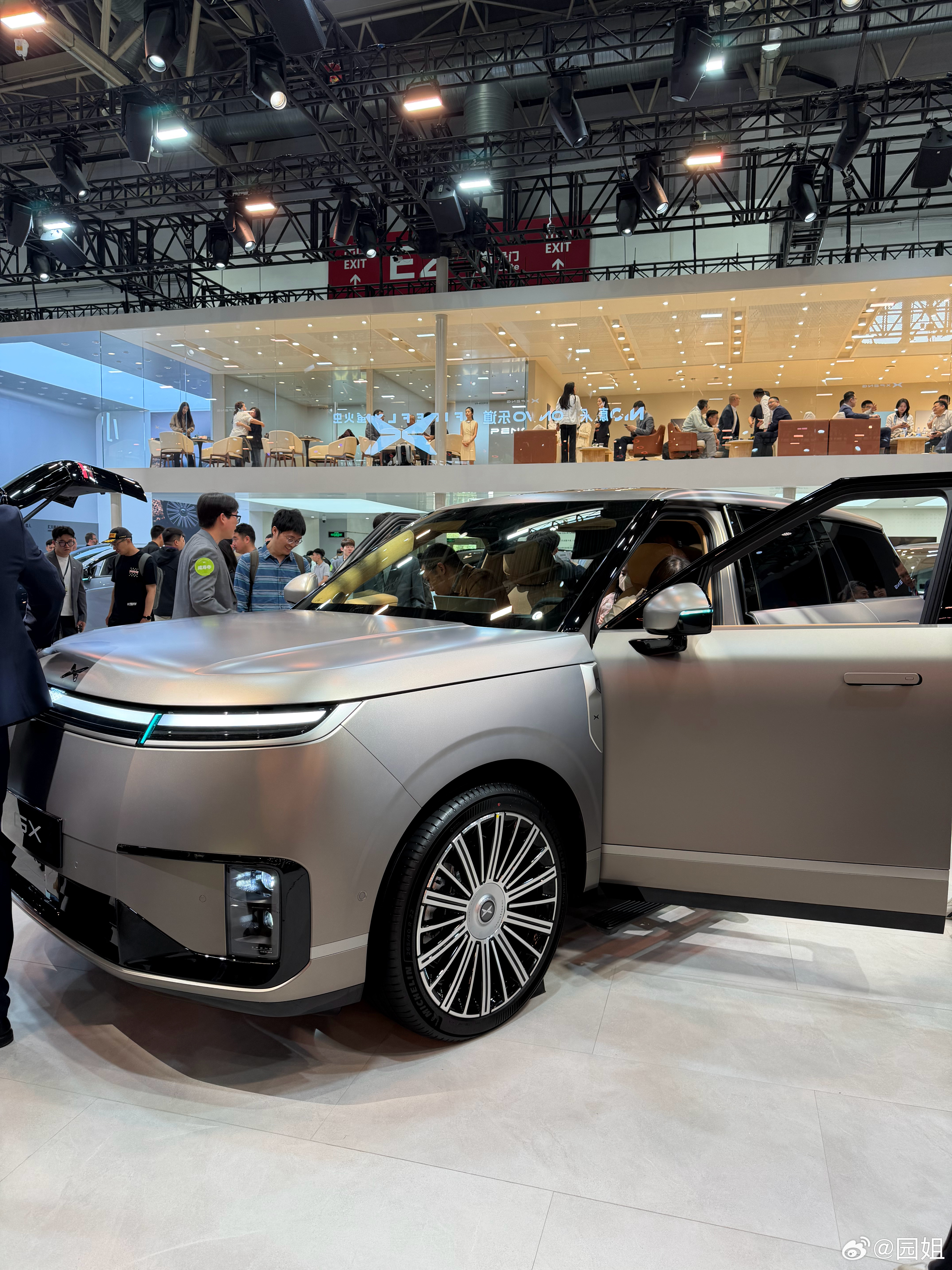 小鹏今年的助力车型就是小鹏GX,场馆里放了C位,看车的人也很多,全尺寸大空间,加上小鹏几乎所有的黑科技打造的期间车型,很有辨识度都车身设计,而且这次还展出了双色车身版本,看起来更高端,PS:大师兄在楼上给客户介绍产品,太敬业了。
