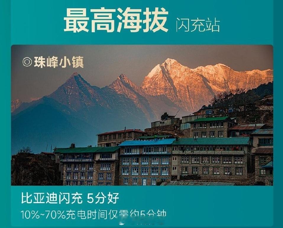 闪充站无盲区,高原也给你安排明白。谁能想到,比亚迪直接把充电桩装到了珠峰脚下!在不久前,在西藏的珠峰小镇上搞了个“全球最高闪充站”,海拔高度、建设难度直接拉满。