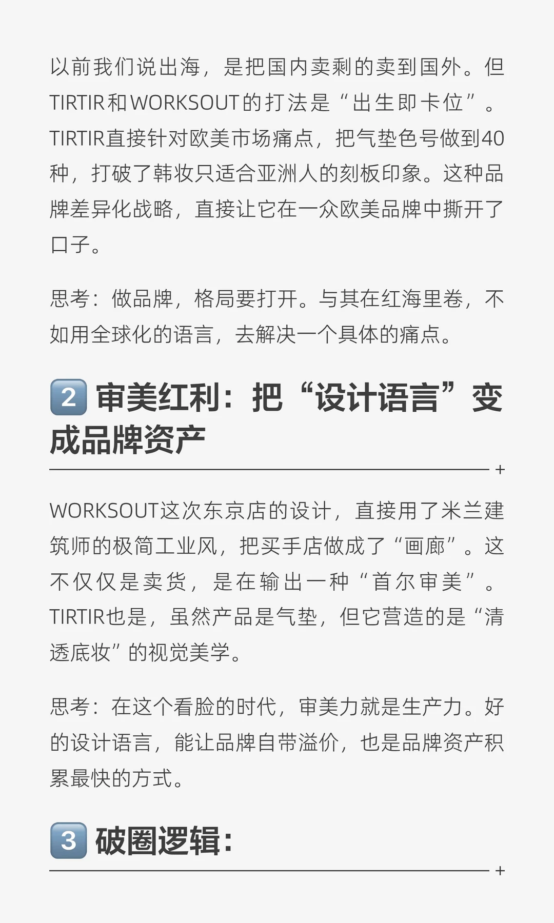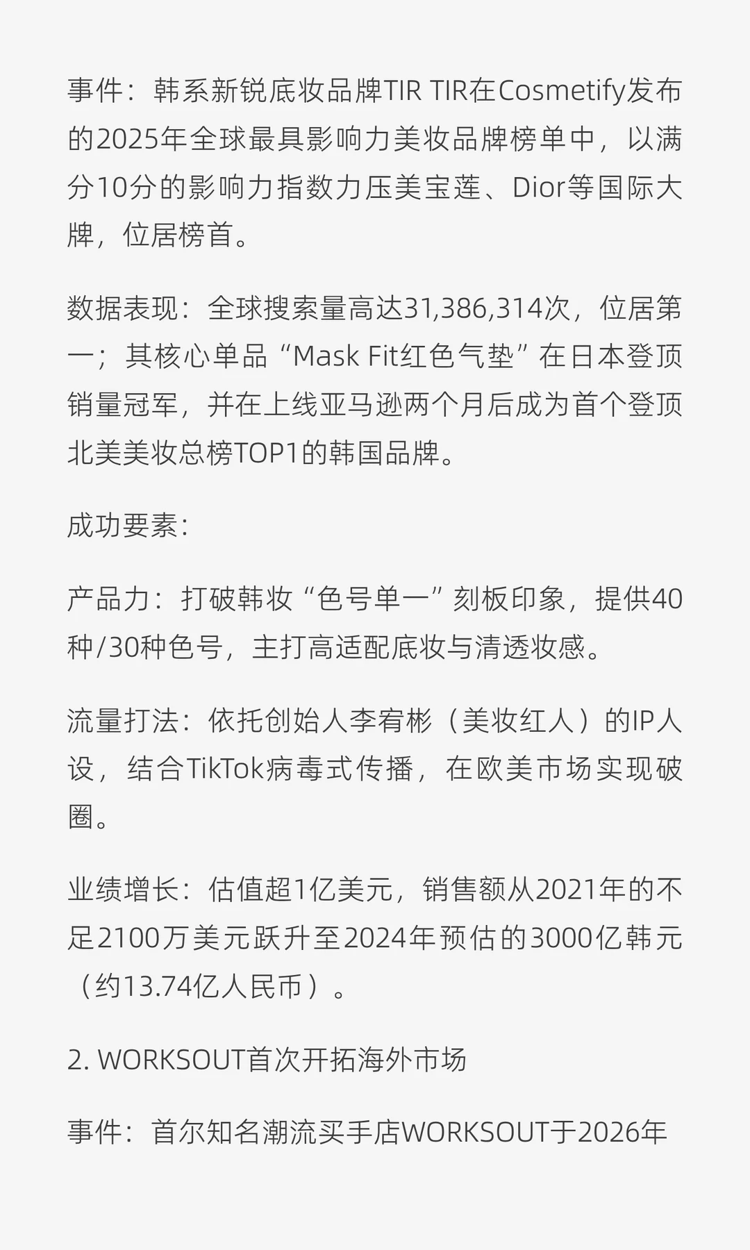 TIRTIR以满分登顶全球美妆品牌榜单,主打高适配底妆,产品力和流量打法获认可。WORKSOUT首次海外旗舰店落户东京,通过高端设计和策展理念,推动韩国潮流文化反向输出。