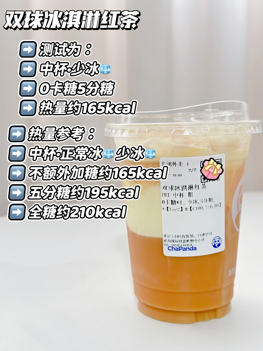 测试为:中杯·少冰🧊0卡糖5分糖 约165kcal