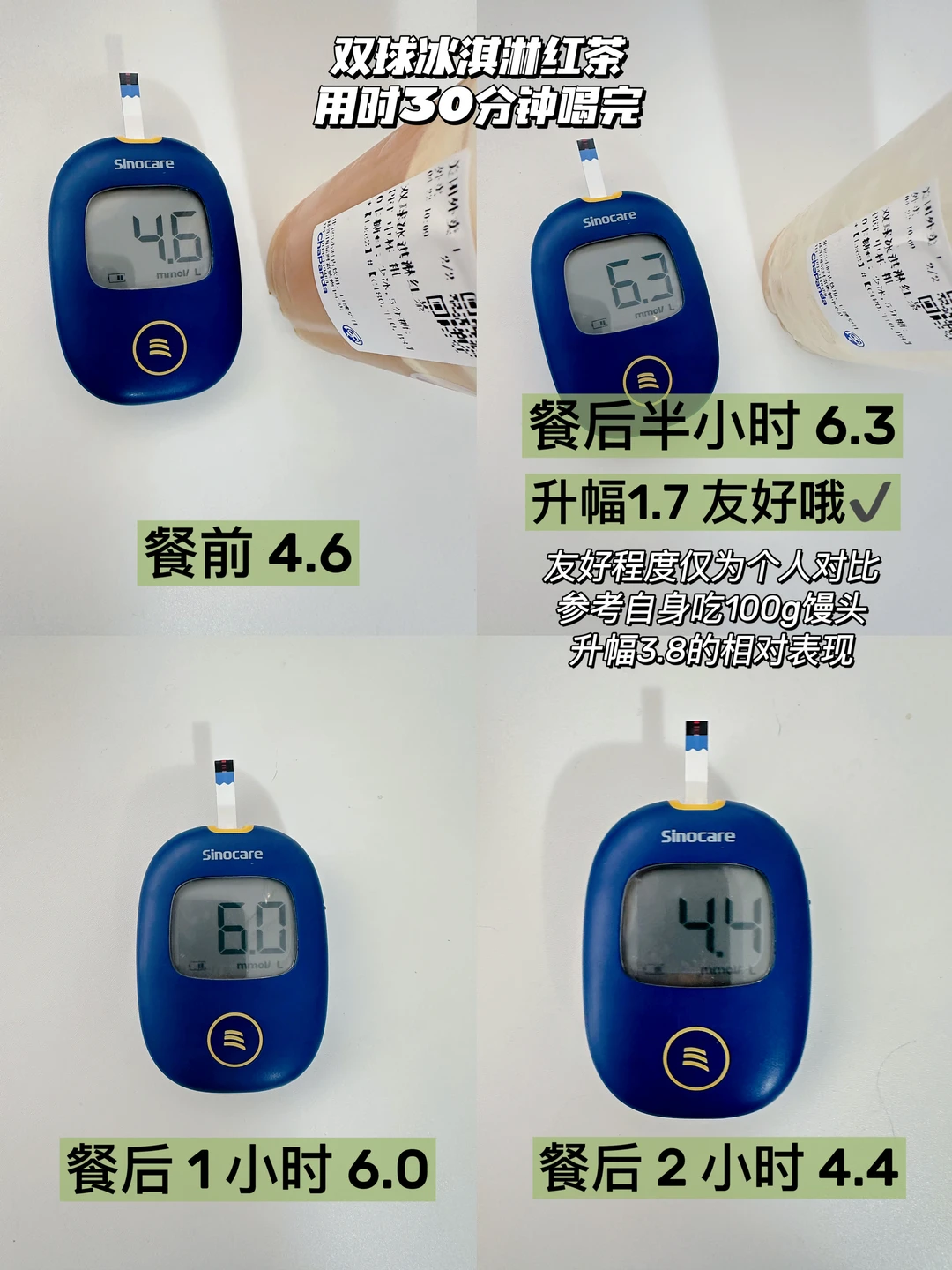 双球冰淇淋红茶是我在茶百道家爱喝排行榜前三的,不另外加糖的也很好喝,但为了和香草抹茶冰统一,这次测了0卡糖的〰️红茶➕冰淇淋的组合很多人喜欢,不踩雷,热量友好,升糖情况也不错,可冲!