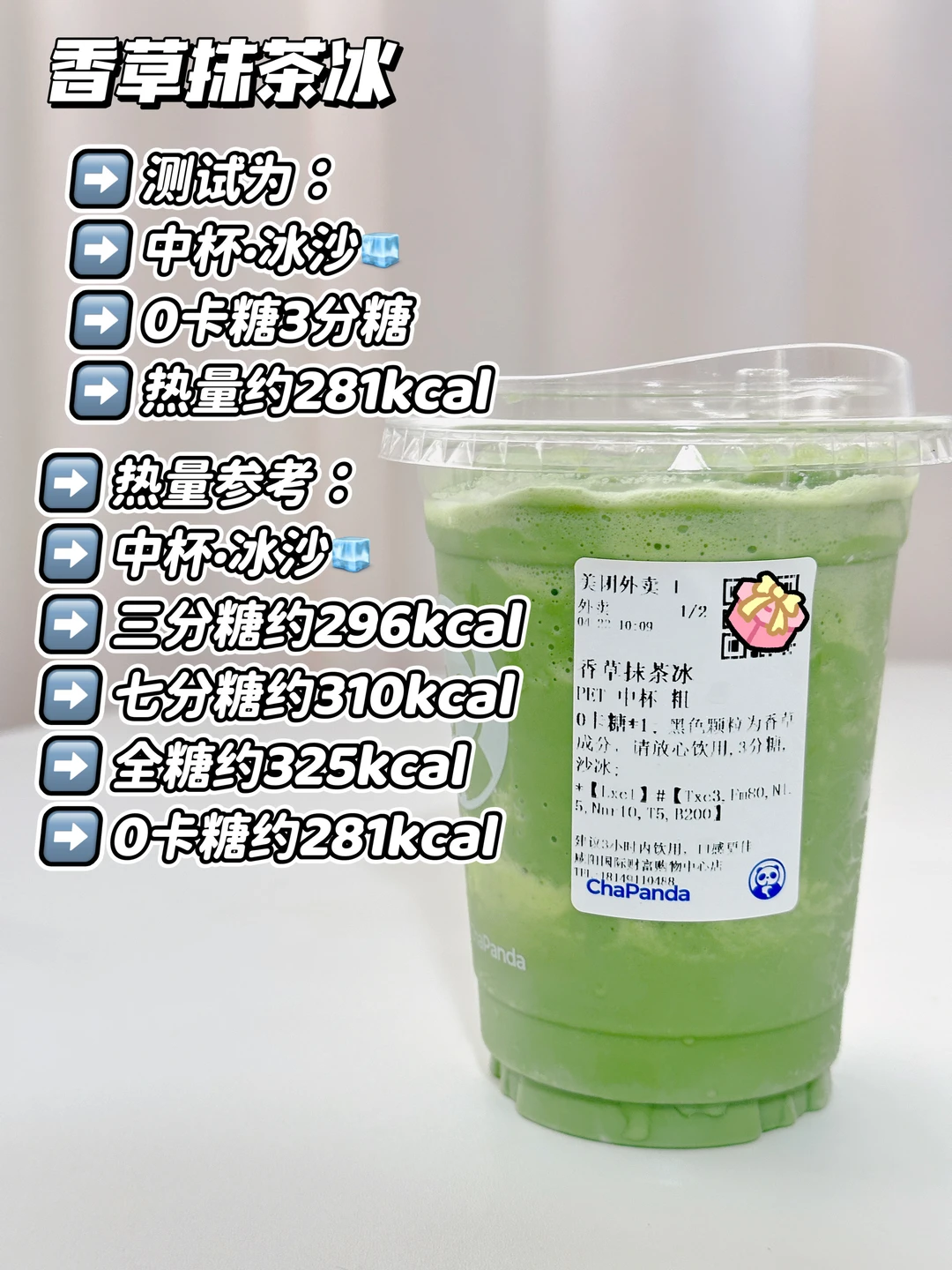 测试为:中杯·冰沙🧊0卡糖3分糖 约281kcal