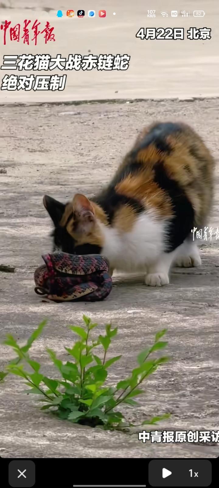 4月22日,北京。女子发视频称,起初听到茂密的叫声,回头一看是一只三花猫,旁边是赤链蛇。不知道猫咪是饿了还是什么,就一直去咬那个蛇。开始担心那个蛇咬到猫,以为蛇有剧毒然而是微毒,被咬到的话伤害不是特别大