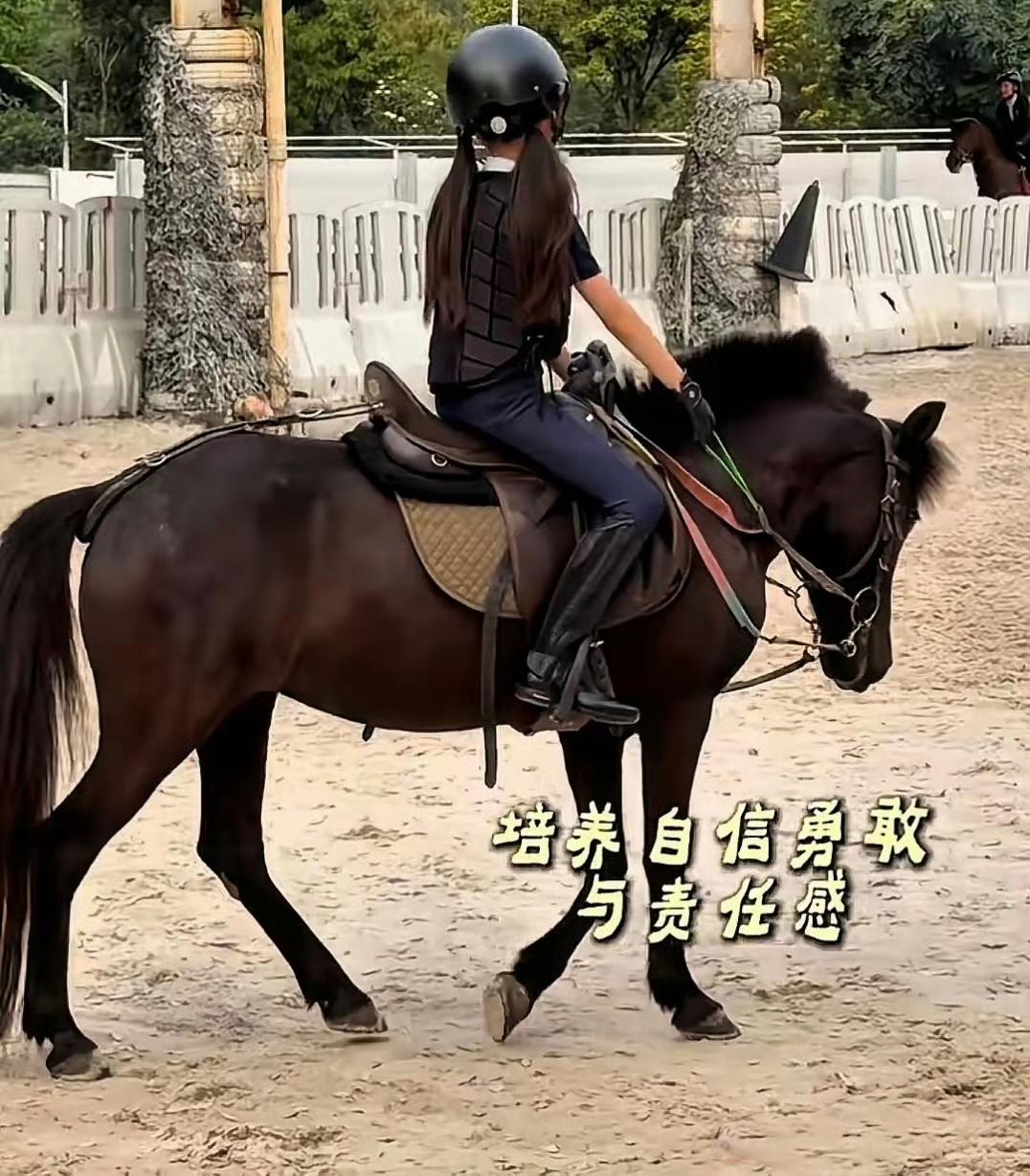 方媛带女儿们体验马术,长女郭咏希身高快赶上妈妈,姐妹俩骑装护具齐全,架势十足。郭