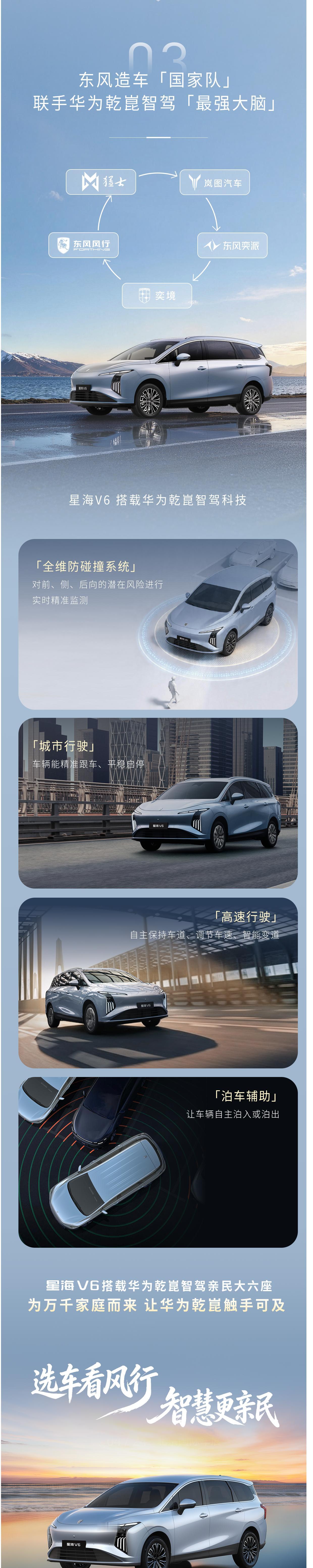 东风风行星海V6正式亮相,并将于今年第三季度正式上市。这台车最大的看点就是它是风行首款搭载华为乾崑智驾的车型,可实现城市跟车,高速变道和泊车辅助等。该车长4835毫米,宽1900毫米,高1755毫米,轴距2900毫米。座椅采用222布局,第三排可下沉并形成全平地板,这点等回头上市时应该可以成为同价卖点