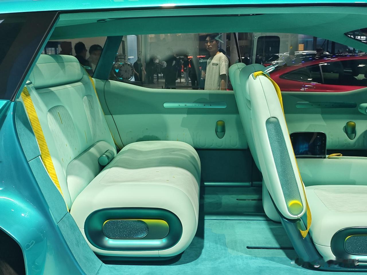 内饰风格更戳人。浅薄荷调的座舱,座椅看着软乎乎的,后排空间敞亮,地台也是全平的。门板和座椅线条都没什么棱角,黄线的小点缀很活泼,完全没有生硬的工业感,倒像个移动的小客厅。