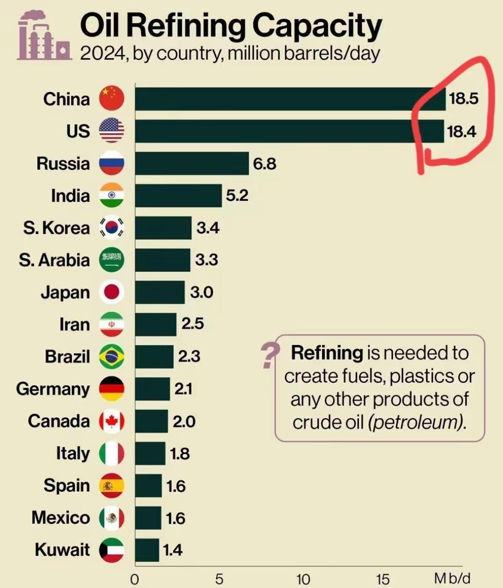 中国炼油能力世界第一,看完我国稀土的政策,只卖成品,不卖原材料和半成品,把稀土绝大部分利润都留在了国内。
