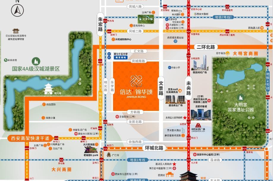 周围还有汉城湖、西安未央区图书馆、龙首商业街、盛龙广场龙首购物中心、西安龙首印象城、西安市未央区未央路小学(方新小学北校区)、2号线大明宫西地铁站、8号线大风阁地铁站、西安交通大学第二附属医院大明宫院区等配套。