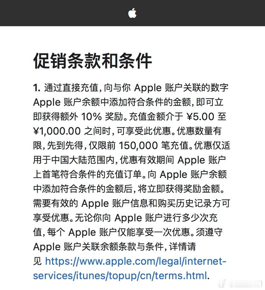 充值金额介于5元至1000元之间时,可享受此优惠。优惠数量有限,先到先得,仅限前15万笔充值。优惠仅适用于中国大陆范围内,优惠有效期间Apple账户上首笔符合条件的充值订单。向Apple账户余额中添加符合条件的金额后,将立即获得奖励金额。