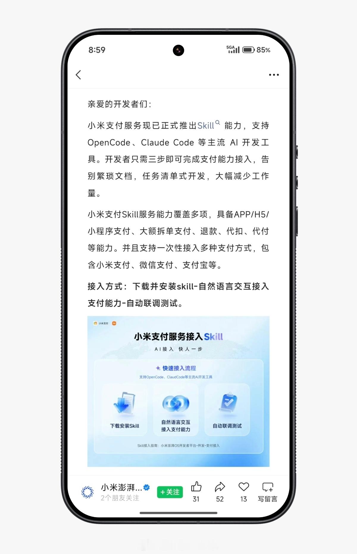 小米澎湃OS3 近日小米澎湃OS开发者平台宣布,小米支付服务现已正式推出Skill 能力,支持 OpenCode、Claude Code 等主流 AI 开发工具。开发者只需三步即可完成支付能力接入,告别繁琐文档,任务清单式开发,大幅减少工作量。
