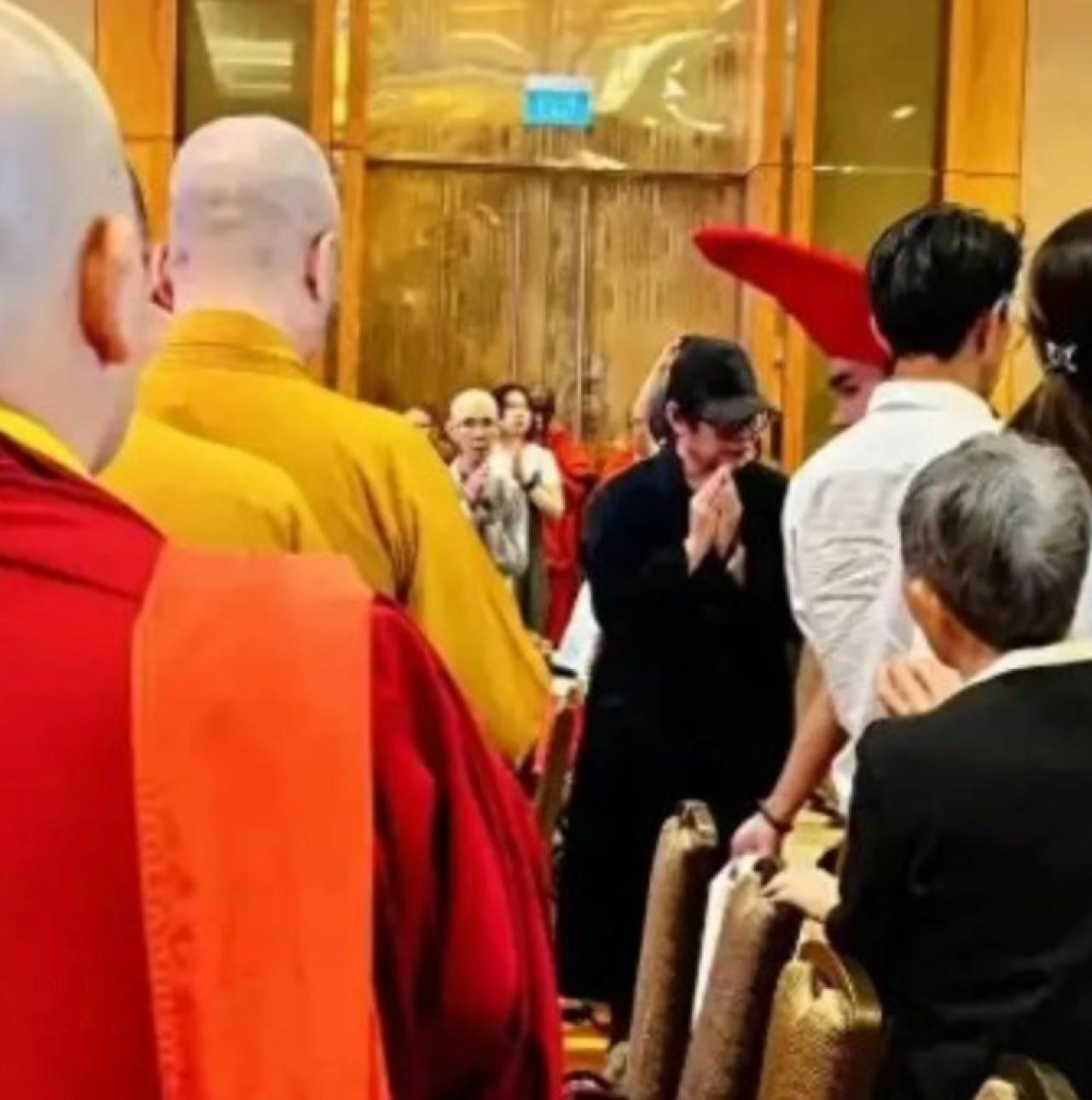 从被公开的照片来看,李连杰身穿黑色衣服,在法会中双手合十,他的周围除了有佛教徒之外,还有穿着僧袍的师傅。重点是李连杰当天的面部略显浮肿,而且气色不太好,看起来就是一副心事重重的样子。