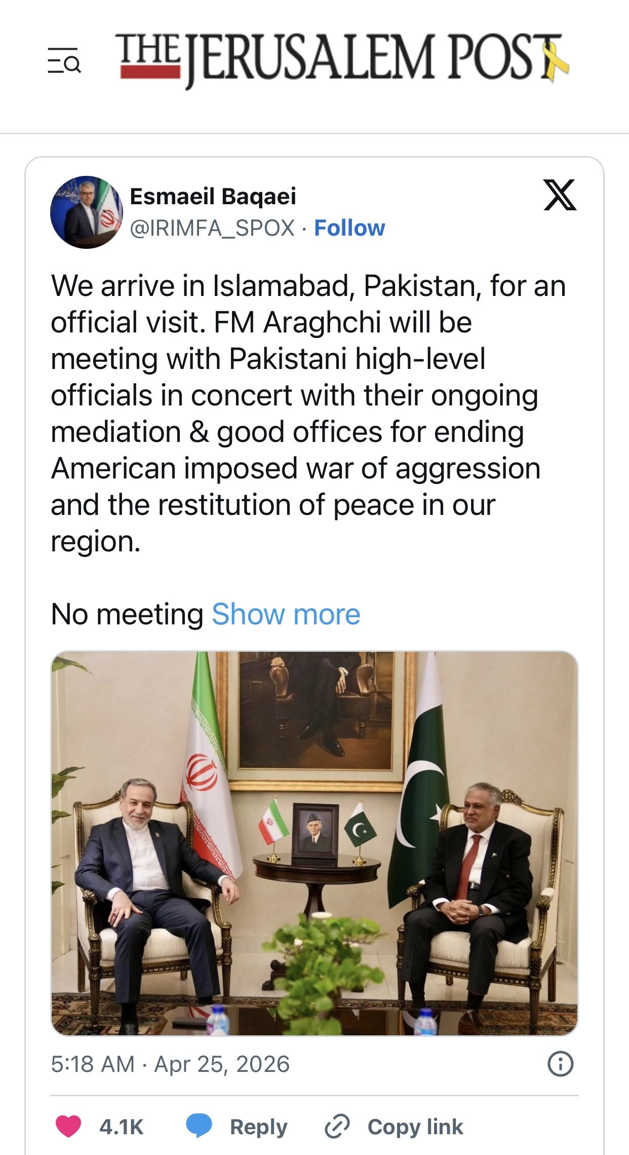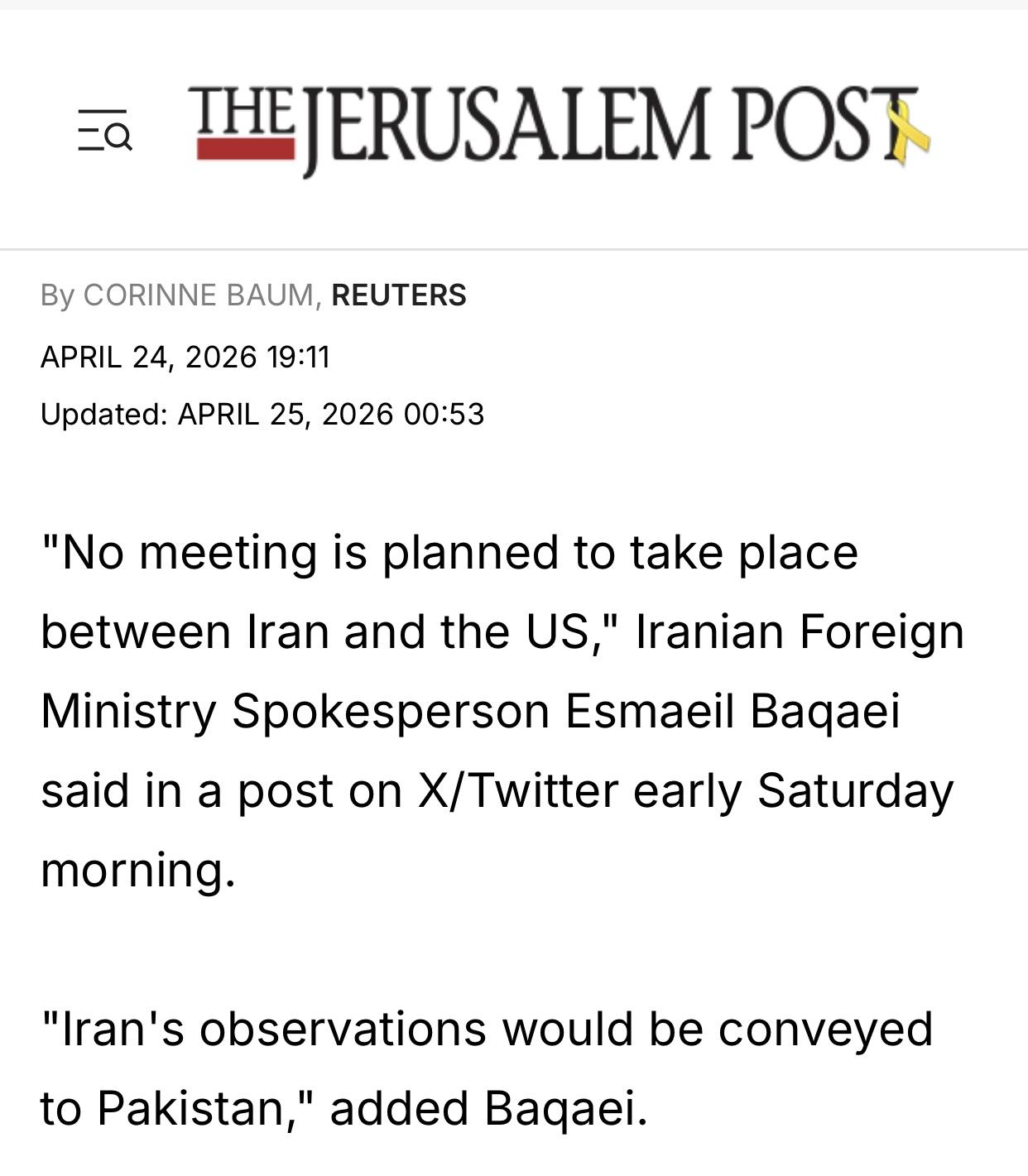 以色列《耶路撒冷邮报》官网4月25日更新报道:”伊朗和美国之间没有计划举行会晤,”伊朗外交部发言人埃斯梅尔·巴卡伊周六凌晨在推特上(图3)发文称,”伊朗的意见将转达给巴基斯坦,”巴卡伊补充道("No meeting is planned to take place between Iran and the US," Iranian Foreign Ministry Spokesperson Esmaeil Baqaei said in a post on X/Twitter early Saturday morning. “Iran's observations would be conveyed to Pakistan," added Baqaei)。