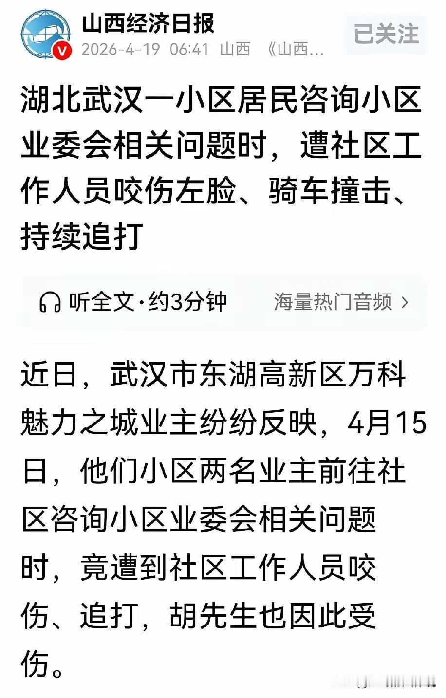 湖北武汉,某小区一男一女两名业主,去社区办公室咨询业委会的事,期间没人搭理他们。两人刚想离开,不料,一男工作人员突然冲过来,猛地推了抱着孩子的女业主一把,随后死死抱住另一男业主,照他脸上咬了一口。业主吓得一溜烟逃跑,对方并不放过他,又骑车追赶、车撞、追打,男业主吓得不行,躲进商铺后报了警,而此事发生的莫名其妙!