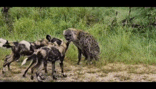偏偏啊偏偏,有一头鬣狗不幸落了单,被一群野狗给包围了。其实,它体型比野狗大一点,动作也很是迅速敏捷,要是奋力一击,能从野狗群里掏出一个口子,想要逃跑倒是也不难。
