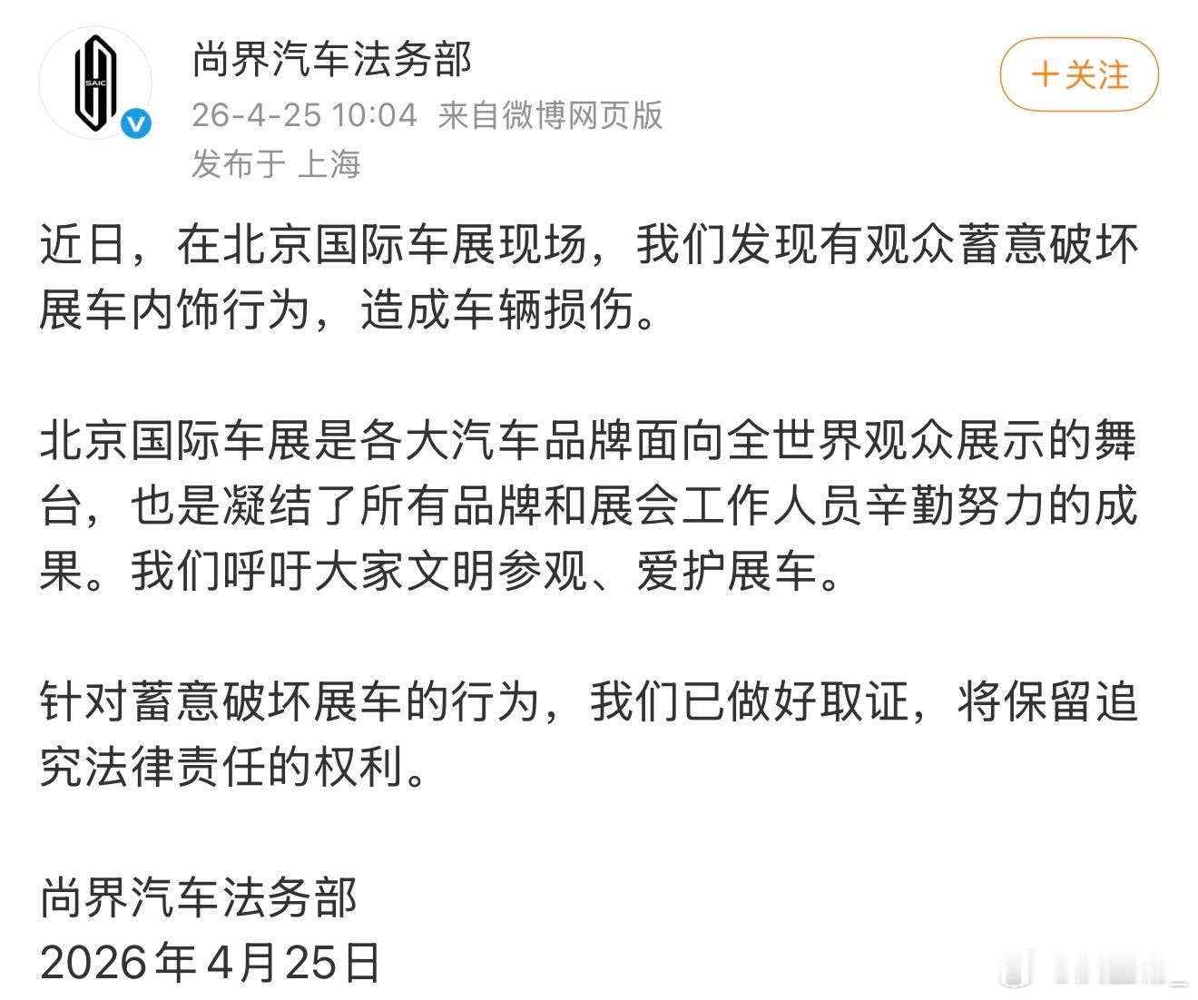 发现有些人,真心眼儿挺坏的尚界展台蓄意去破坏展车,然后说车做工有问题不知道现在到处都是摄像头的吗?现在尚界法务部已经取证了真的该好好处罚一下这些没有底线的所谓媒体人!被蓄意破坏展车尚界汽车法务部发文2026北京车展尚界z7t