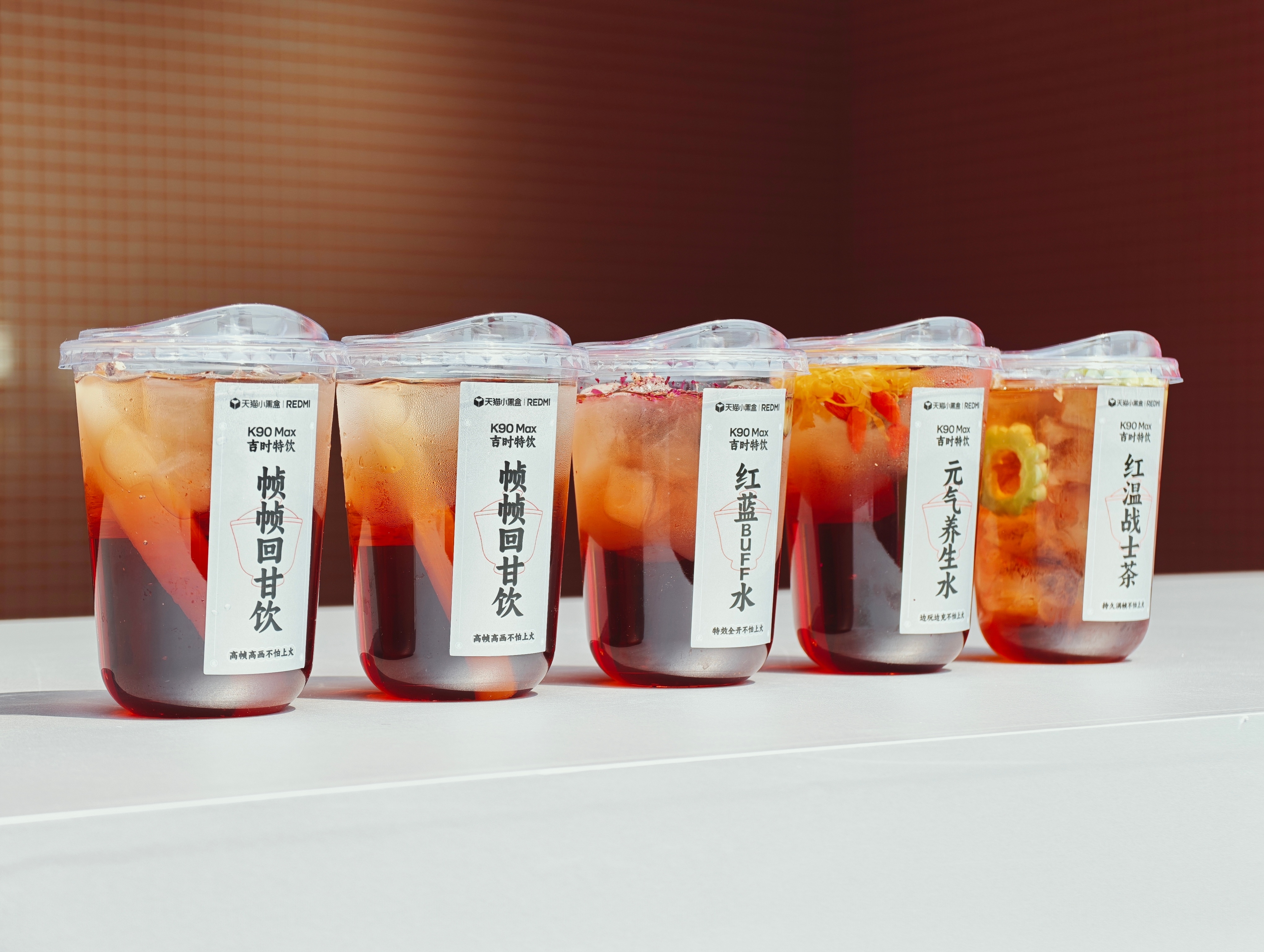 快闪现场特调饮品也超有梗,每一杯都是王老吉与水果或者茶组成的搭配,还对应着游戏场景:帧帧回甘饮(王老吉+甘蔗):高帧游戏,清甜回甘。红温战士茶(王老吉+苦瓜):久战不热,不怕上火。团战定心饮(王老吉+小青柠):激斗时刻,清爽定心。红蓝BUFF水(王老吉+蓝莓+玫瑰):颜值口感双在线。元气养生水(王老吉+枸杞+菊花):边玩边充,元气满满。
