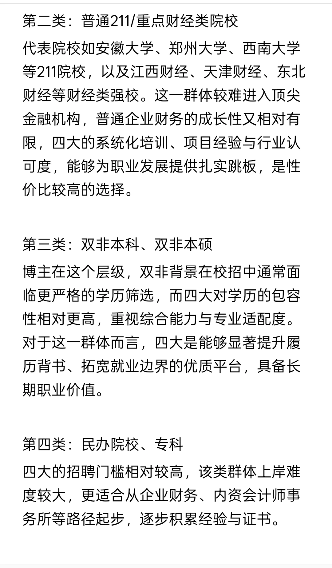 代表院校如安徽大学、郑州大学、西南大学等211院校,以及江西财经、天津财经、东北财经等财经类强校。这一群体较难进入顶尖金融机构,普通企业财务的成长性又相对有限,四大的系统化培训、项目经验与行业认可度,能够为职业发展提供扎实跳板,是性价比较高的选择。