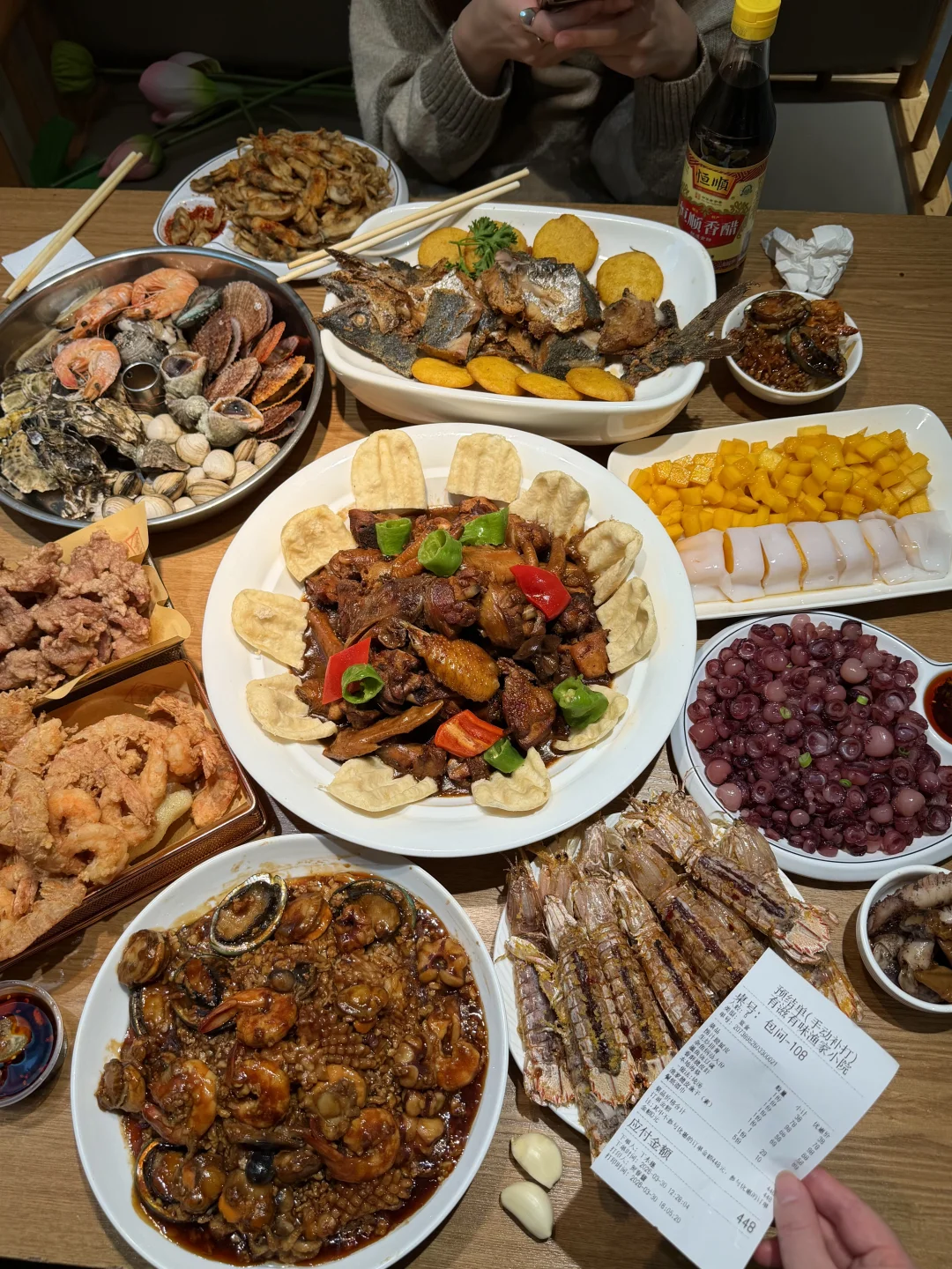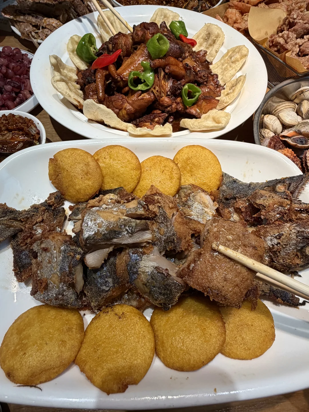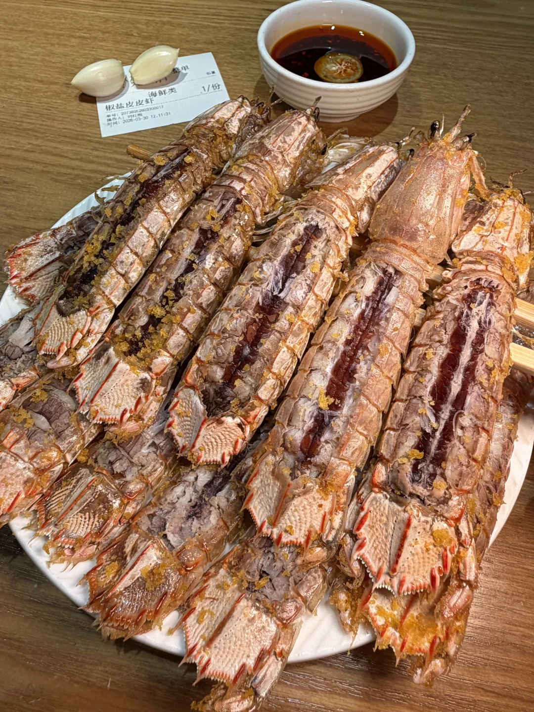凉拌海灵菇,吃起来脆脆的!椒盐皮皮虾还有椒盐蛏子,都挺好吃的!烤鲅鱼也是特色