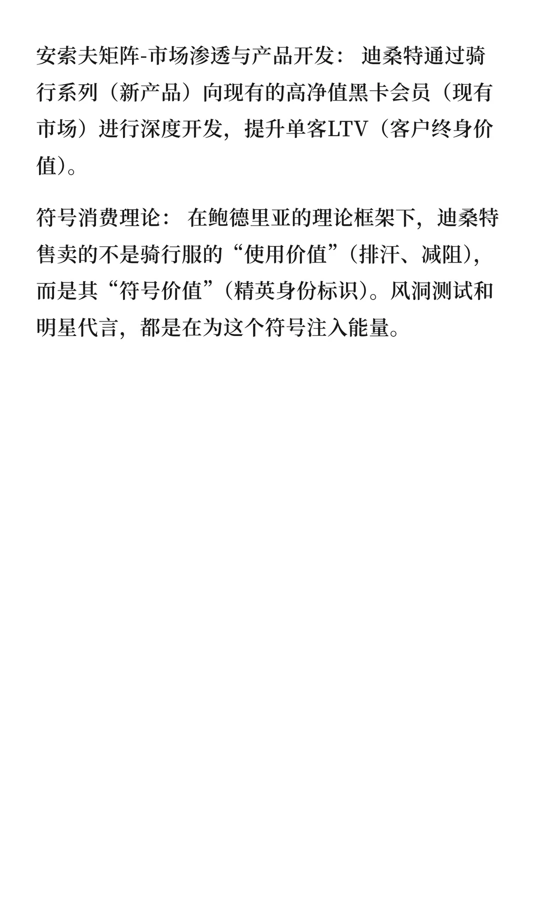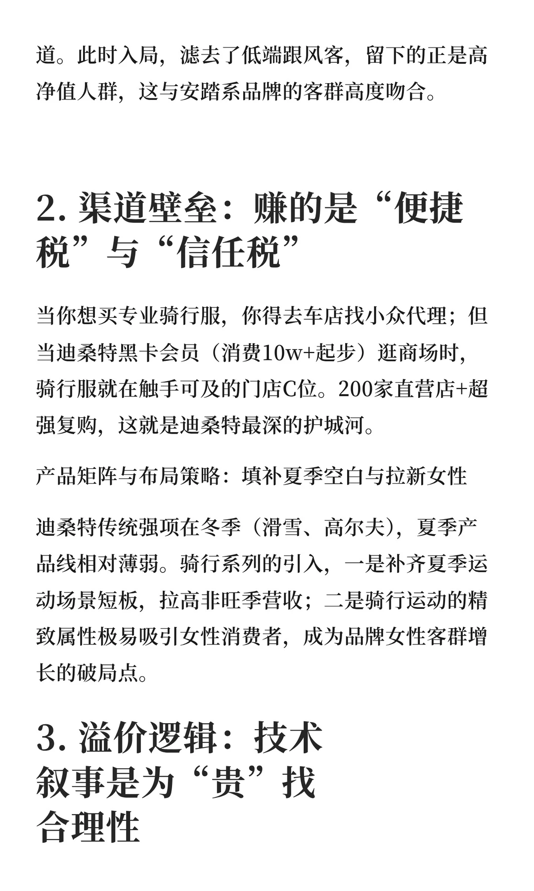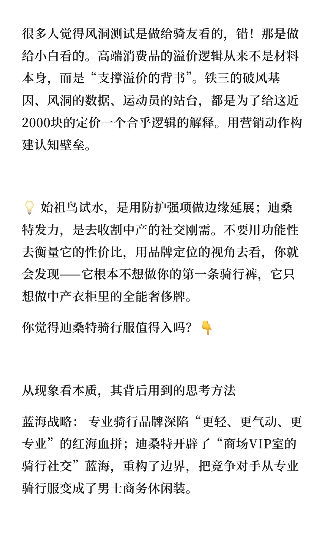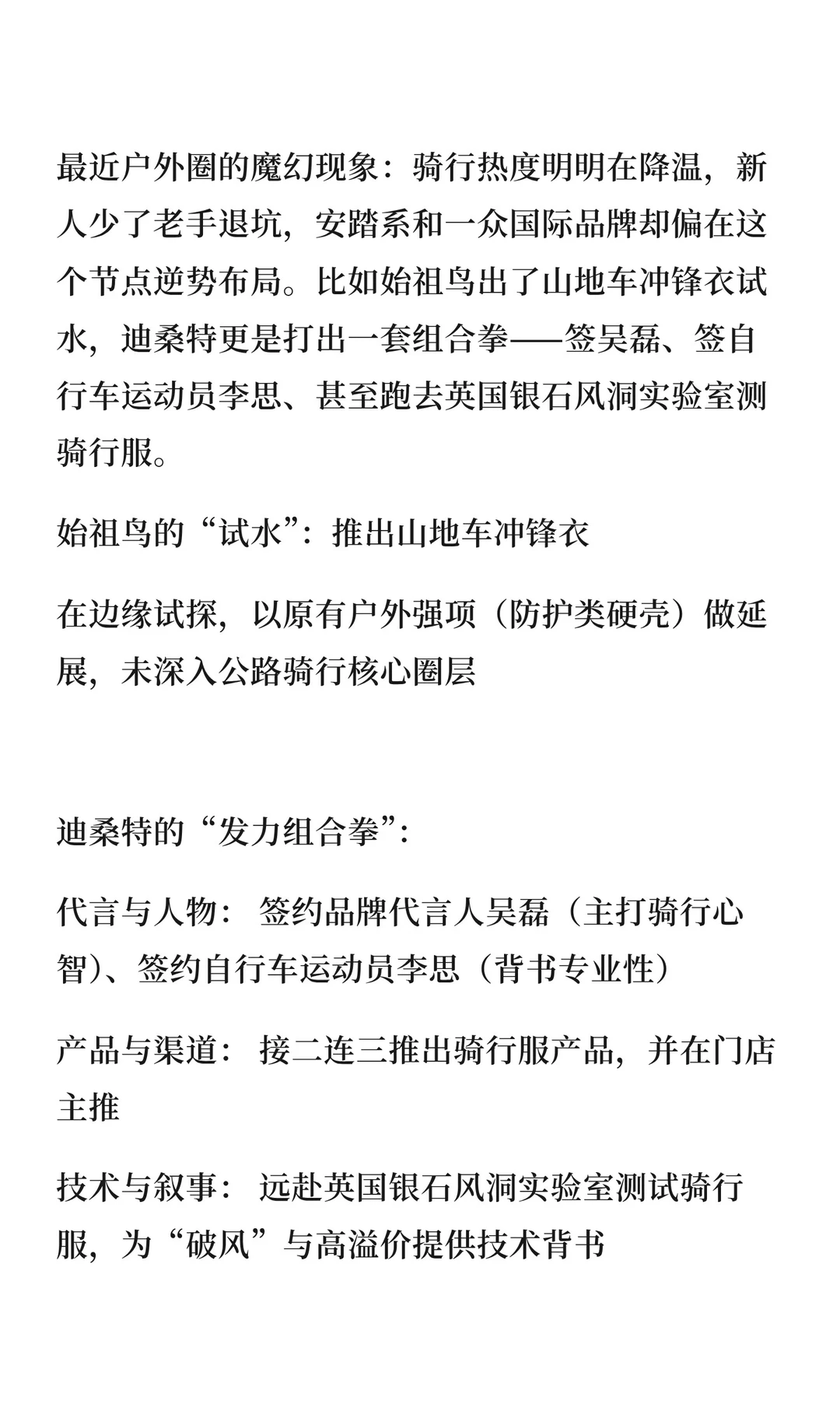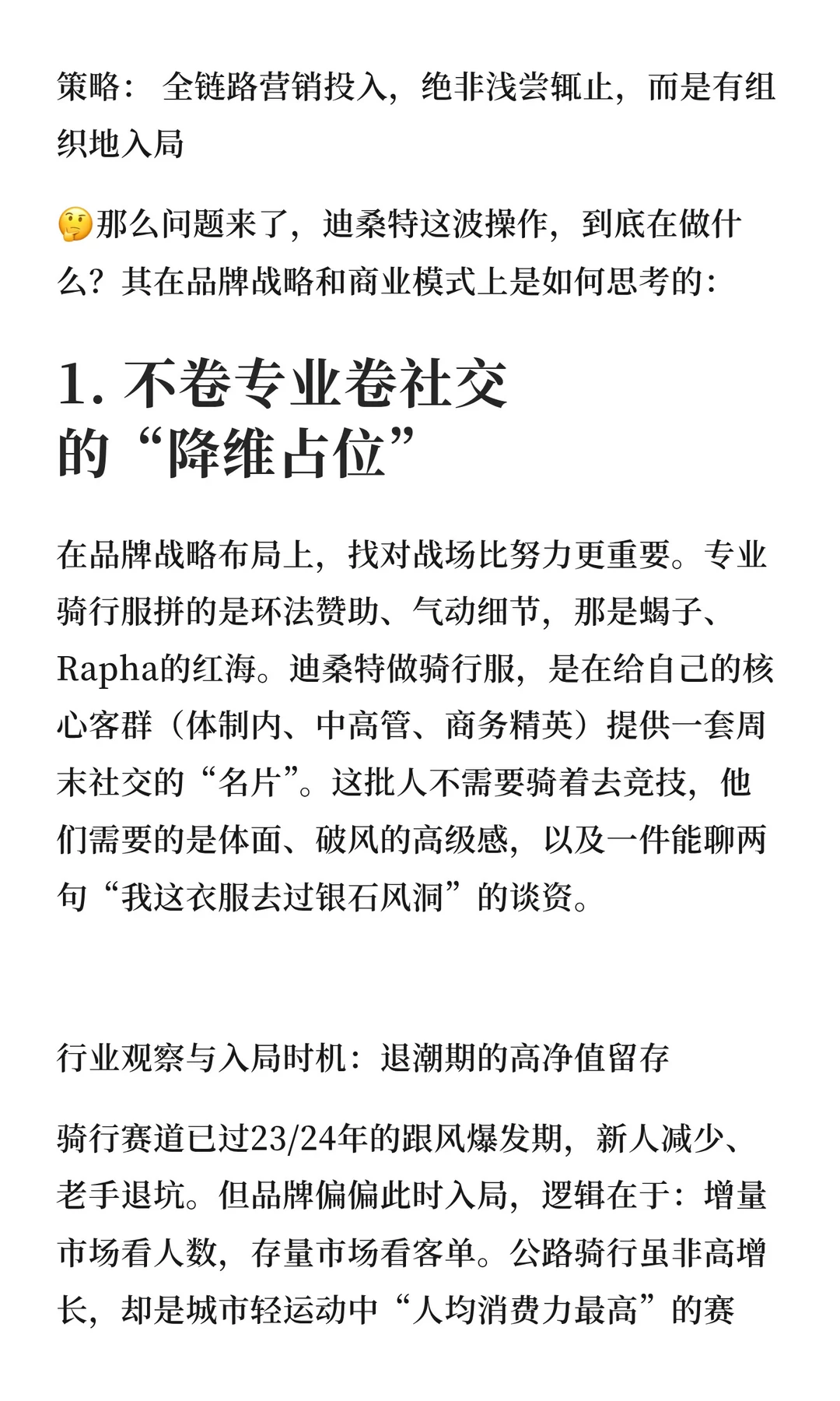 迪桑特通过代言、产品测试和门店布局,瞄准中产社交需求,推出骑行服,填补夏季空白,吸引女性消费者,构建高端形象,而非直接竞争专业骑行市场。