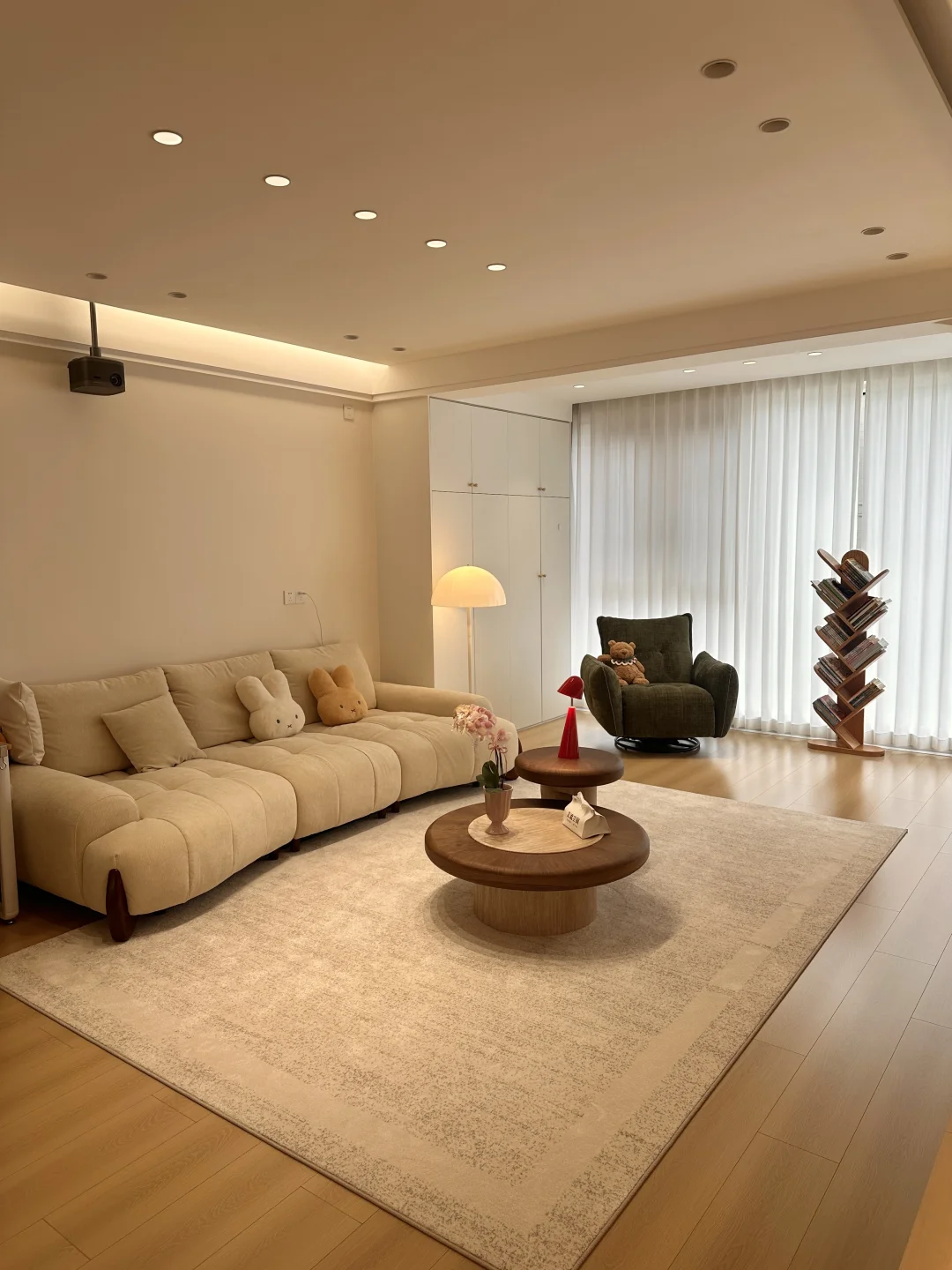 客厅开间有4米5,米色超坐深沙发,搭配一块有质感的地毯