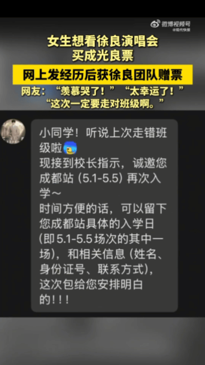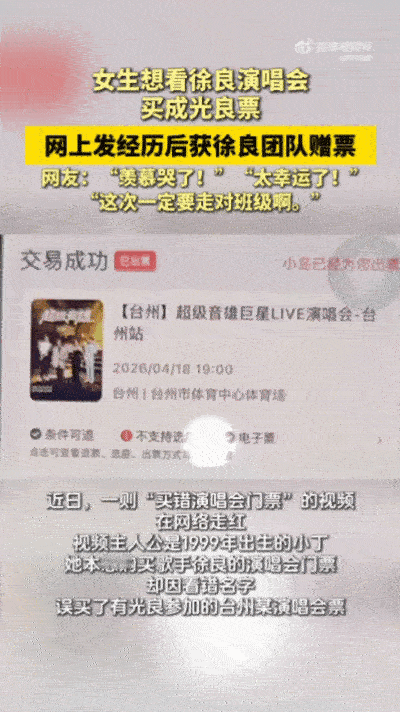 徐良团队给买错票粉丝赠票小丁因为一个“良”字买错演唱会门票,走红后被徐良团队注意到,不仅送了成都站门票,还贴心安排好后续。而今天成都场二开,5月1日场也火速售罄,粉丝的幸运和演唱会的火爆都狠狠羡慕了!